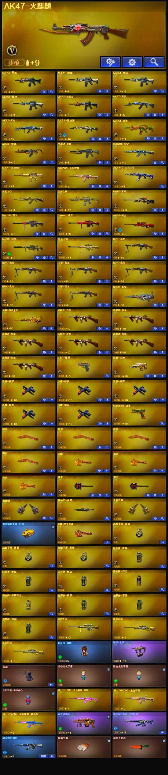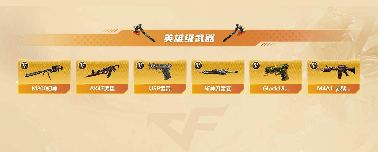 【英雄级武器】:USP-雷暴,斩神刀-雷暴,M4A1-武圣,Glock18-武圣,QBZ03-金色蔷薇,M4A1-雷神*3,M4A1-黑龙,M4A1-玫瑰精灵,M4A1-黑骑士,RPK-盘龙*6,加特林-炼狱,汤姆逊-烈龙*6,AK47-无影,AK47-火麒麟,AK12-天启,AN94-超新星,AWM-天龙,Barrett-毁灭,Barrett-极光,AWM-裁决,M4A1-龙血,M200-幻神,AK47-黑鲨,M4A1-赤狱骑士,沙鹰-天神,沙鹰-修罗*5,麒麟刺,擎天*2,龙啸*3,屠龙*4