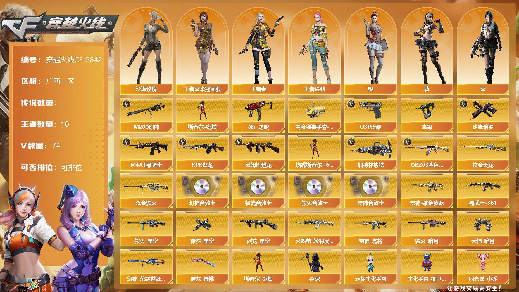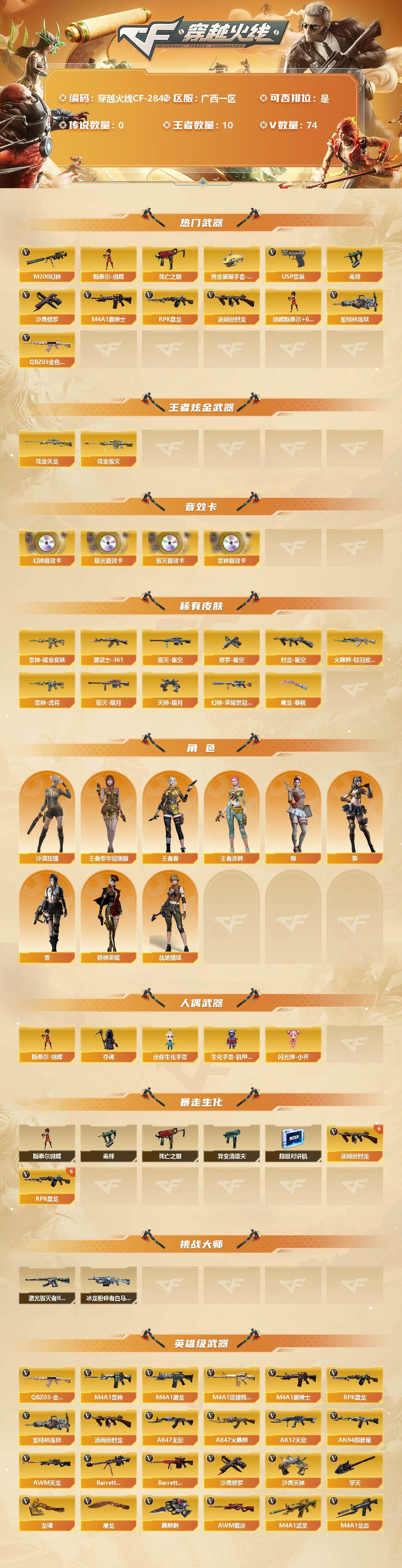 [12946086]广西一区-74V-10王者-3炫金 【热门武器】:QBZ03-金色蔷薇,M200-幻神,死亡之眼,毒蜂,M4A1-黑骑士,汤姆逊-烈龙*6,RPK-盘龙*6,加特林-炼狱,斯泰尔-蝴蝶,USP-雷暴,沙鹰-修罗*5,黄金猫猫手套-白鲨 【王者炫金武器】:炫金天龙*2,炫金毁灭 【音效卡】:M200-幻神音效卡,M4A1-雷神音效卡,Barrett-毁灭音效卡,Barrett-极光音效卡 【稀有皮肤】:M200-幻神-荣耀世冠白鲨,雷神-虎将,雷神-耀金皮肤,火麒麟-轻羽皮肤,毁灭-暗月*2,毁灭-星空,AK47-黑武士-361,烈龙-星空,修罗-星空,天神-暗月*2,屠龙-春桃 皮肤 【角色】:王者零-华冠丽服,王者春,王者涂鸦,零,葵,樱,沙漠玫瑰,战地猎狐,铁骑荣耀 【人偶武器】:斯泰尔-蝴蝶,夺魂,迷你生化手雷*2,生化手雷-机甲核心,闪光弹-小乔 【暴走生化】:斯泰尔-蝴蝶,毒蜂,死亡之眼,异变清道夫,超级对讲机 【挑战大师】:激光毁灭者III-白马银枪,冰龙粉碎者-白马银枪 【英雄级武器】:USP-雷暴,斩神刀-雷暴,M4A1-武圣,Glock18-武圣,QBZ03-金色蔷薇,M4A1-雷神*3,M4A1-黑龙,M4A1-玫瑰精灵,M4A1-黑骑士,RPK-盘龙*6,加特林-炼狱,汤姆逊-烈龙*6,AK47-无影,AK47-火麒麟,AK12-天启,AN94-超新星,AWM-天龙,Barrett-毁灭,Barrett-极光,AWM-裁决,M4A1-龙血,M200-幻神,AK47-黑鲨,M4A1-赤狱骑士,沙鹰-天神,沙鹰-修罗*5,麒麟刺,擎天*2,龙啸*3,屠龙*4 【特殊枪械】:蝴蝶斯泰尔+6烈龙,1黑骑士,6烈龙,6盘龙,1炼狱,1蝴蝶斯泰尔
