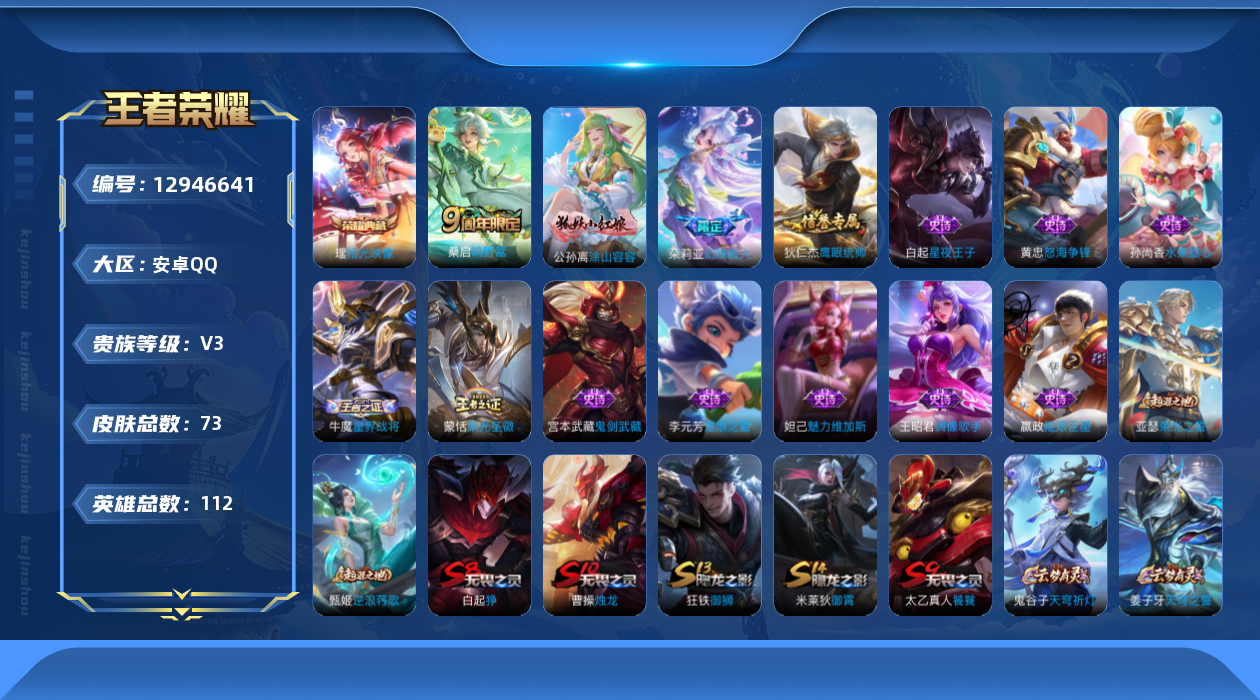 [12946641]【特价急出/详情看图】:安卓Q-V3-至尊星耀IV段位-112英雄-73皮肤-1典藏-1传说-13史诗 【荣耀典藏】:瑶拾光映像 【传说皮肤】:桑启鸣野蒿 【限定皮肤】:白起狰,姜子牙天穹之誓,狄仁杰阴阳师,夏侯惇朔风刀,曹操烛龙,狄仁杰万华元夜,太乙真人饕餮,苏烈千军破阵,裴擒虎擒涛扼浪,狂铁御狮,米莱狄御霄,鲁班大师探海日志,张良古海寻踪,蒙恬荣光圣徽,鬼谷子天穹祈灯,刘邦剑破天穹,周瑜熔金海岸 【赛季限定】:白起狰,夏侯惇朔风刀,曹操烛龙,狄仁杰万华元夜,张良古海寻踪,太乙真人饕餮,苏烈千军破阵,裴擒虎擒涛扼浪,狂铁御狮,米莱狄御霄,鲁班大师探海日志,鬼谷子天穹祈灯,蒙恬荣光圣徽,刘邦剑破天穹,姜子牙天穹之誓 【史诗皮肤】:王昭君偶像歌手,宫本武藏鬼剑武藏,孙尚香水果甜心,嬴政摇滚巨星,妲己魅力维加斯,李元芳逐浪之夏,白起星夜王子,狄仁杰鹰眼统帅,蒙恬荣光圣徽,黄忠怒海争锋,牛魔星界战将,朵莉亚幻珠鲛人,公孙离涂山容容 【其他皮肤】:露娜哥特玫瑰,赵云忍炎影,扁鹊救世之瞳,安琪拉玩偶对对碰,妲己少女阿狸,亚瑟死亡骑士,张飞五福同心,甄姬花好人间,狄仁杰阴阳师,关羽龙腾万里,白起狰,太乙真人饕餮,曹操烛龙,老夫子功夫老勺,孙尚香沉稳之力,李白敏锐之力,狂铁御狮,米莱狄御霄,小乔丁香结,夏侯惇朔风刀,狄仁杰万华元夜,刘禅秘密基地,鲁班大师乓乓大师,苏烈千军破阵,程咬金无双福将,猪八戒潮玩探月行,裴擒虎擒涛扼浪,莱西奥西部游侠,鲁班大师探海日志,张良古海寻踪,鬼谷子天穹祈灯,朵莉亚金色潮汐,廉颇功夫炙烤,刘邦剑破天穹,姜子牙天穹之誓,周瑜熔金海岸,东皇太一噬灭天穹,甄姬逆浪荇歌,亚瑟荣光之誓,鲁班七号福禄兄弟,高渐离金属狂潮,项羽帝国元帅,孙膑未来旅行,孙悟空西部大镖客,后羿精灵王,刘禅英喵野望,李元芳特种部队,马可波罗激情绿茵,诸葛亮星航指挥官,黄忠芝加哥教父,东皇太一东海龙王,女娲尼罗河女神,伽罗花见巫女,嫦娥露花倒影,猪八戒年年有余,瑶森,司空震启蛰,云缨赤焰之缨 【营地ID】:1722594334