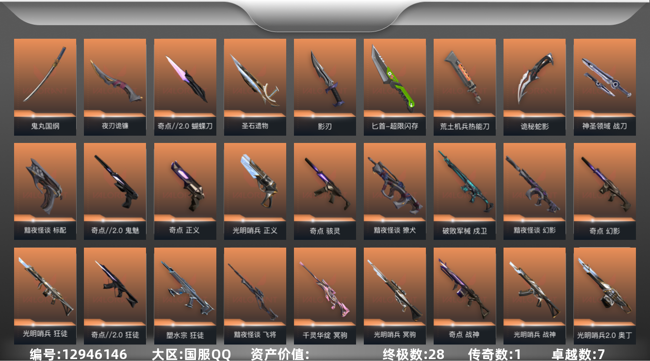[12946146]皮肤资产价值56040/已用R点1310/【套装】:光明哨兵套装,奇点//2.0套装,黯夜怪谈套装,回火礼包:奇点套装,掠影套装 【英雄】:幻棱,炼狱,维斯,暮蝶,钛狐,铁臂,捷风,雷兹,幽影,不死鸟,贤者,猎枭,零,芮娜,霓虹,盖可,钢锁 【近战 武器】:近战武器-奇点//2.0 蝴蝶刀,近战武器-鬼丸国纲,近战武器-超限闪存 匕首,近战武器-荒土机兵 热能刀,近战武器-圣石遗物,近战武器-夜刃诡镰,近战武器-影刃,近战武器-诡秘蛇影 军刀,近战武器-神圣领域 战刀 【狂徒】:狂徒-艾沃莉的梦之翼,狂徒-光明哨兵,狂徒-奇点//2.0,狂徒-塑水宗,狂徒-掠影,狂徒-盖世英雄,狂徒-荒土机兵,狂徒-诡秘蛇影 【幻影】:幻影-黯夜怪谈,幻影-奇点,幻影-超限闪存,幻影-神圣领域,幻影-纳米打击,幻影-末日之翼 【戍卫】:戍卫-破败军械,戍卫-掠影,戍卫-浮光跃金,戍卫-逆冲蛮牛,戍卫-月球哨兵,戍卫-折光棱晶 【獠犬】:獠犬-黯夜怪谈,獠犬-神圣领域,獠犬-模拟赫兹,獠犬-逆冲蛮牛 【冥驹】:冥驹-光明哨兵,冥驹-千灵华绽,冥驹-掠影,冥驹-荒土机兵,冥驹-模拟赫兹,冥驹-星云暗涌 【飞将】:飞将-黯夜怪谈,飞将-末日之翼 【莽侠】:莽侠-超限闪存,莽侠-诡秘蛇影,莽侠-月球哨兵 【战神】:战神-光明哨兵,战神-奇点,战神-神圣领域,战神-浮光跃金 【奥丁】:奥丁-光明哨兵//2.0,奥丁-纳米打击,奥丁-末日之翼 【判官】:判官-天界神兵//2.0,判官-诡秘蛇影,判官-纳米打击x 【雄鹿】:雄鹿-紫阙金琅//2.0,雄鹿-模拟赫兹,雄鹿-逆冲蛮牛,雄鹿-月球哨兵 【骇灵】:骇灵-奇点,骇灵-荒土机兵,骇灵-浮光跃金,骇灵-星云暗涌 【蜂刺】:蜂刺-超限闪存,蜂刺-星云暗涌,蜂刺-折光棱晶 【标配】:标配-黯夜怪谈,标配-荒土机兵,标配-浮光跃金,标配-折光棱晶 【正义】:正义-光明哨兵,正义-奇点,正义-掠影,正义-超限闪存,正义-纳米打击,正义-月球哨兵 【鬼魅】:鬼魅-奇点//2.0,鬼魅-诡秘蛇影,鬼魅-模拟赫兹,鬼魅-星云暗涌 【狂怒】:狂怒-神圣领域,狂怒-逆冲蛮牛 【短炮】:短炮-末日之翼 【卡面】:终章:激斗汉堡 卡面,进入射程 卡面,分崩离析 卡面,纳米打击 卡面,抑制技术 卡面,激斗汉堡 卡面,瓦娃脸雪糕 P2 卡面,从黄昏到黎明 卡面,荒土
