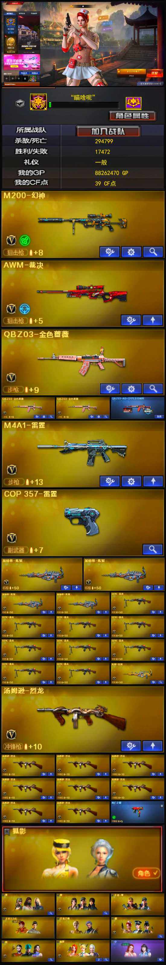 【热门武器】:QBZ03-金色蔷薇*3,M200-幻神,死亡之眼,金色小号,M4A1-黑骑士*11,汤姆逊-烈龙*9,RPK-盘龙*9,加特林-炼狱*4,沙鹰-修罗*11