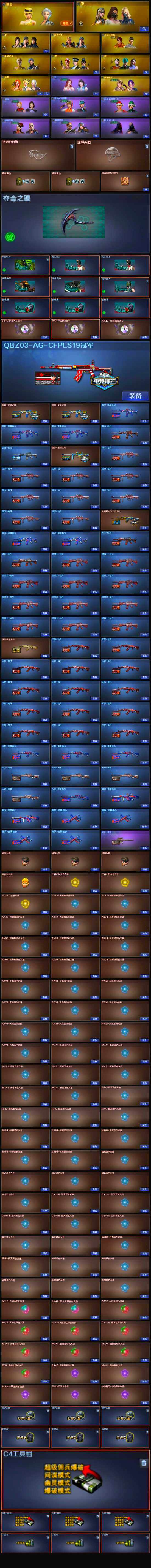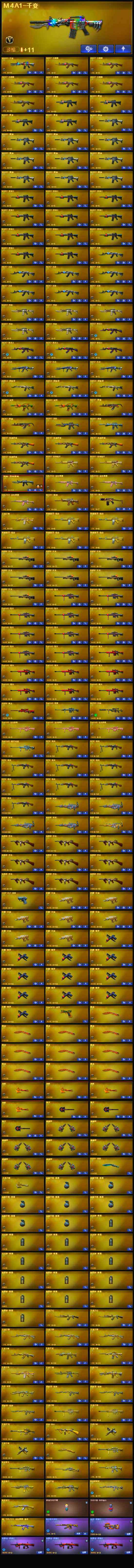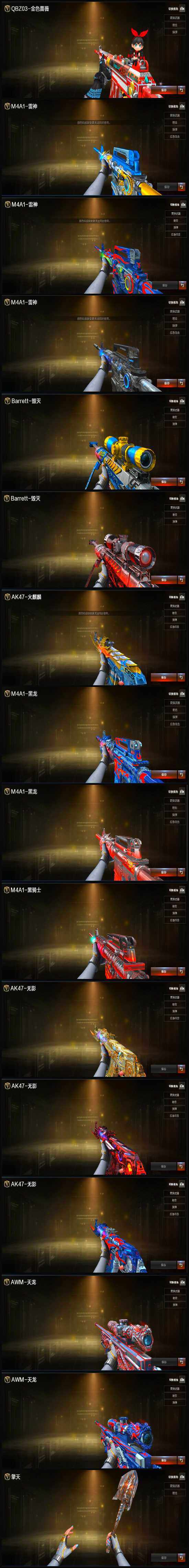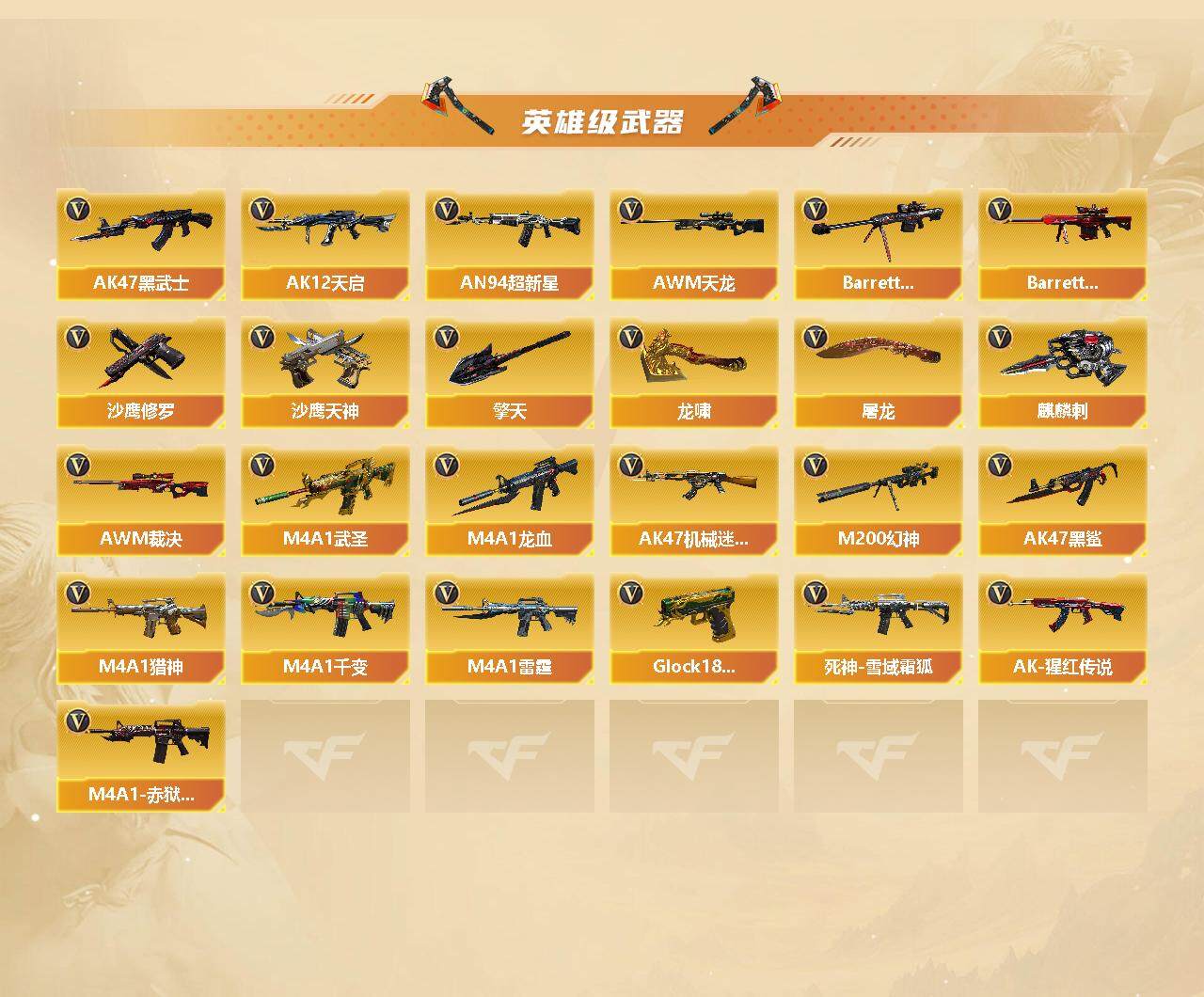 【英雄级武器】:M4A1-雷霆,M4A1-武圣*2,Glock18-武圣,QBZ03-金色蔷薇*3,M4A1-雷神*10,M4A1-黑龙*4,M4A1-玫瑰精灵*2,M4A1-黑骑士*11,M4A1-死神*5,RPK-盘龙*9,加特林-炼狱*4,汤姆逊-烈龙*9,AK47-麒麟,AK47-无影*7,AK47-火麒麟*5,AK47-黑武士*4,AK12-天启*3,AN94-超新星*3,AWM-天龙*7,Barrett-毁灭*10,Barrett-极光*7,AWM-裁决,M4A1-龙血,AK47-机械迷城*4,M200-幻神,AK47-黑鲨*2,M4A1-猎神,M4A1-千变*2,死神-雪域霜狐,AK-47-猩红传说,M4A1-赤狱骑士,沙鹰-天神*7,沙鹰-修罗*11,麒麟刺*7,擎天*3,龙啸*4,屠龙*10