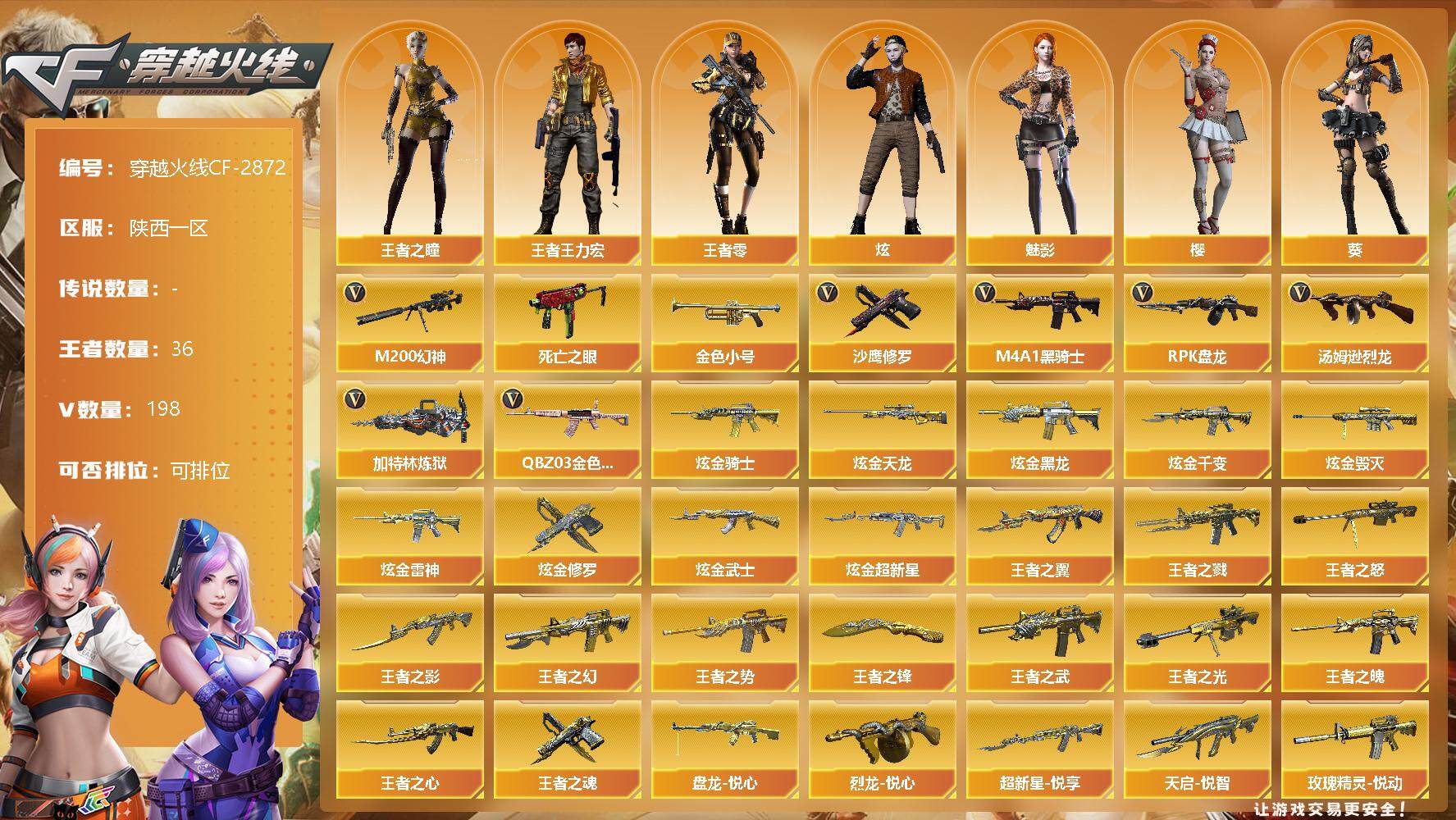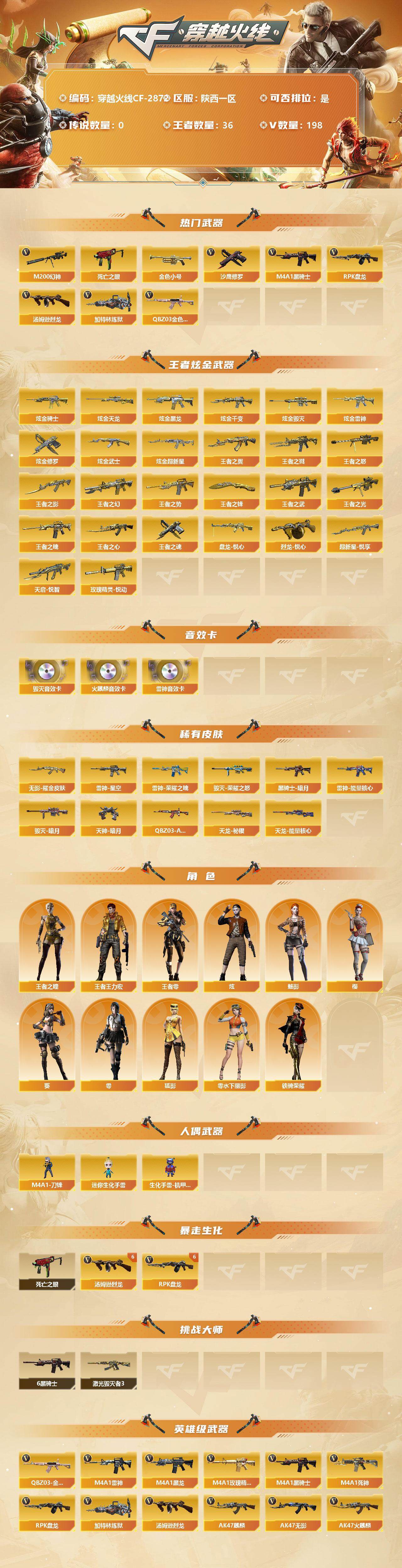[12946272]陕西一区-198V-36王者-12炫金 【热门武器】:QBZ03-金色蔷薇*3,M200-幻神,死亡之眼,金色小号,M4A1-黑骑士*11,汤姆逊-烈龙*9,RPK-盘龙*9,加特林-炼狱*4,沙鹰-修罗*11 【王者炫金武器】:炫金骑士,炫金天龙,炫金黑龙*2,炫金千变,炫金毁灭*2,炫金雷神,炫金修罗*2,炫金武士,炫金超新星,盘龙-悦心,烈龙-悦心,王者之戮,超新星-悦享*3,天启-悦智,王者之幻,王者之翼,王者之势,王者之武,玫瑰精灵-悦动*5,王者之光,王者之影*3,王者之怒*2,王者之魄,王者之心*2,王者之魂*2,王者之锋 【音效卡】:AK47-火麒麟音效卡,M4A1-雷神音效卡,Barrett-毁灭音效卡 【稀有皮肤】:QBZ03-AG-CFPLS19冠军,雷神-能量核心*3,雷神-荣耀之魄*2,雷神-星空,黑骑士-暗月*11,毁灭-暗月*9,毁灭-荣耀之怒,天龙-秘银*4,天龙-能量核心,无影耀金皮肤,天神-暗月*10 【角色】:王者-零,王者之瞳,王者王力宏,狐影,零-水下丽影,零,葵,樱,魅影,炫,铁骑荣耀 【人偶武器】:M4A1-刀锋,迷你生化手雷,生化手雷-机甲核心 【暴走生化】:死亡之眼 【挑战大师】:激光毁灭者III 【英雄级武器】:M4A1-雷霆,M4A1-武圣*2,Glock18-武圣,QBZ03-金色蔷薇*3,M4A1-雷神*10,M4A1-黑龙*4,M4A1-玫瑰精灵*2,M4A1-黑骑士*11,M4A1-死神*5,RPK-盘龙*9,加特林-炼狱*4,汤姆逊-烈龙*9,AK47-麒麟,AK47-无影*7,AK47-火麒麟*5,AK47-黑武士*4,AK12-天启*3,AN94-超新星*3,AWM-天龙*7,Barrett-毁灭*10,Barrett-极光*7,AWM-裁决,M4A1-龙血,AK47-机械迷城*4,M200-幻神,AK47-黑鲨*2,M4A1-猎神,M4A1-千变*2,死神-雪域霜狐,AK-47-猩红传说,M4A1-赤狱骑士,沙鹰-天神*7,沙鹰-修罗*11,麒麟刺*7,擎天*3,龙啸*4,屠龙*10 【特殊枪械】:6黑骑士,6烈龙,6盘龙,4炼狱