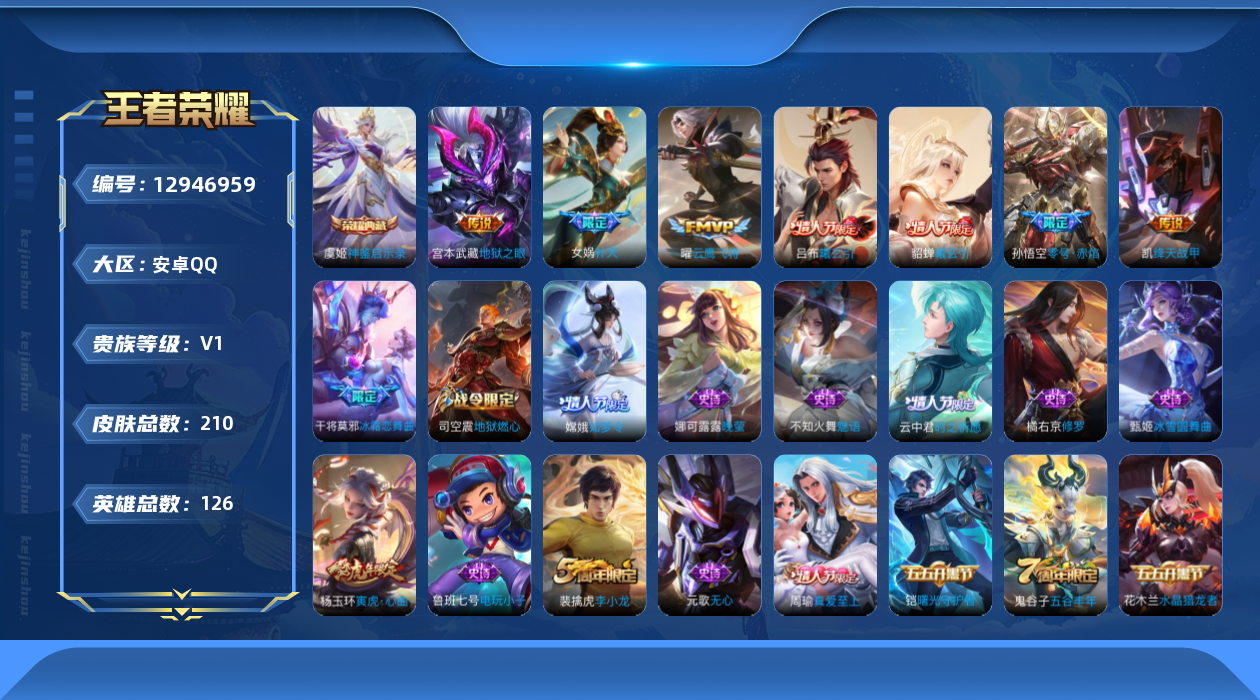 - [11528187]V9 2典藏 1珍品传说 39传说 125英雄 353皮肤 典藏英雄武则天 可修改实名 优质装备:无限飓风号(高达),弑枪猎影(韩信典藏),江户川柯南,黄金狮子座,黄金射手座,冠军飞将,云鹰飞将(小将军),绛天战甲(鸡嘴战神),黄金白羊座,猫影幻舞,久胜战神,炽阳神光,末日机甲-孙尚香(绿蚂蚱),地狱火,零号·赤焰,海洋之心,地狱之眼,飞鸢探春,胖达荣荣,乞巧织情,时之恋人-刘备(电焊工),游龙清影(小青龙),淬星耀世,挚爱之约,无双飞将,记忆之芯(机甲兔),百相守梦(张飞),灼幽烈阳,惊梅引,大乔-时之奇旅,黄金天蝎座 传说皮:祥瑞亨通,幻光神枪 珍宝阁皮:蔷薇恋人,女武神,玩趣恶龙 限定皮:愿照·九州拓(澜年限),愿照·福禄聚(蔡文姬年限),愿照·岁时盈(虞姬年限),愿照·山河定(司空震年限),愿照·众生和(妲己年限),愿照·千秋盛(女娲年限),逐霄战戟,鸣野蒿,至尊宝,遇见飞天,高山流水,五谷丰年,冰锋战神,武圣,天狼运算者,游园惊梦,梁祝,烈魂,天狼溯光者,虎魄,天狼征服者,天狼绘梦者,李小龙,逐梦之影,引擎之心 史诗皮:器灵·浮梦炉,东方月初,百相守梦-百里守约,紫霞仙子,苍穹之光,电玩小子(小书包),白龙吟,黄金分割率,特工魅影,千年之狐,江河有灵,魅语,蒙恬荣光圣徽,冰冠公主,偶像歌手,电玩·爆裂旋风,百相守梦(刘备),暗夜猫娘,龙骑士(小龙虾),末日机甲-吕布,猫狗日记-孙策,猫狗日记-大乔,时之恋人-孙尚香,乱世虎臣,节奏热浪,修罗,女仆咖啡,摇滚巨星,水果甜心,绅士熊喵,天才门将,星夜王子,心灵骇客,功夫厨神,德古拉伯爵,暗隐猎兽者,幽灵船长,鬼剑武藏,心灵战警,乐园奇幻夜,舞动绿茵,地狱岩魂,纤云弄巧,繁星吟游(呼啦呼啦),拒霜思,缤纷独角兽,乘风破浪,逐浪之夏,月团寄思,水晶猎龙者,曙光守护者,箭羽风息,唤灵魅影,金属风暴,圣诞狂欢,圣诞恋歌,鹰眼统帅,魅力维加斯,滕王阁序,千筹问战,无心,未来纪元-赵云