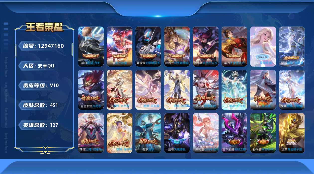 [12947160]【特价急出/详情看图】:安卓Q-V10-永恒钻石IV段位-127英雄-451皮肤-6典藏-1无双-1珍品传说-43传说-147史诗