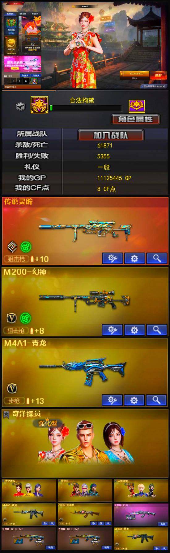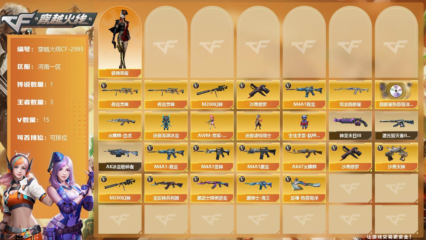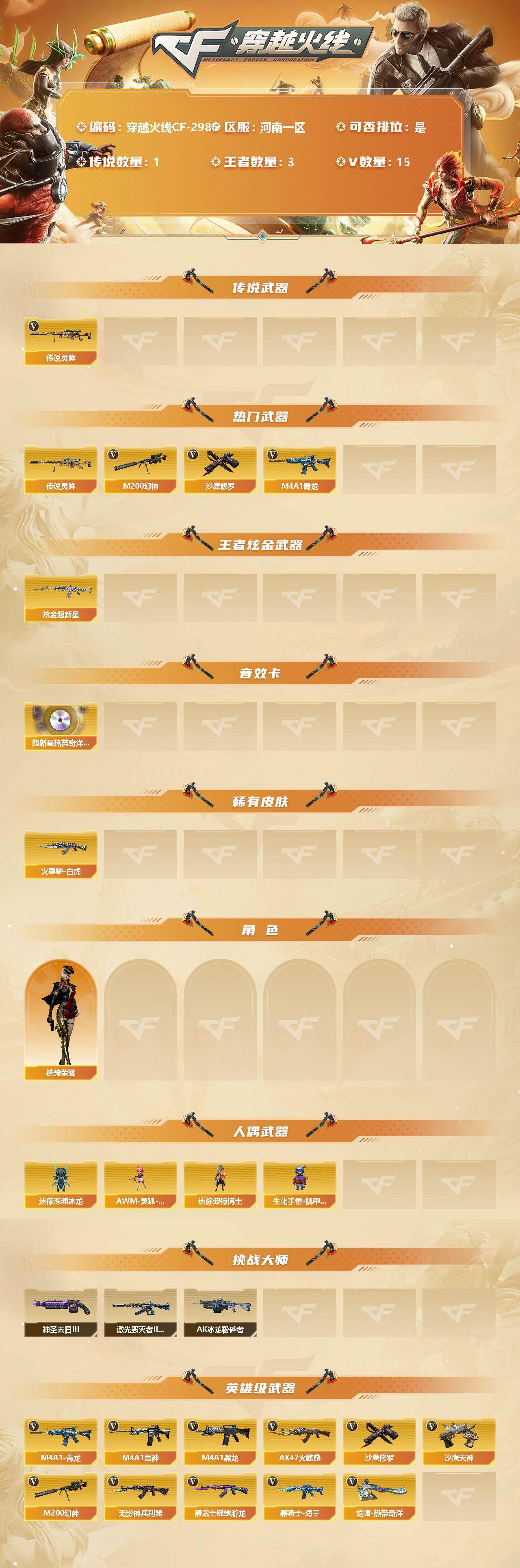 [12947143]河南一区-15V-3王者-1炫金 【传说武器】:传说灵眸 【热门武器】:传说灵眸,M4A1-青龙,M200-幻神,沙鹰-修罗 【王者炫金武器】:炫金超新星 【音效卡】:AN94-超新星-热带奇洋音效卡 【稀有皮肤】:火麒麟-白虎 【角色】:铁骑荣耀 【人偶武器】:AWM-灵狐-15周年嘉年华,迷你深渊冰龙,迷你波特博士,生化手雷-机甲核心 【挑战大师】:神圣爆裂者-末日III,激光毁灭者III-白马银枪,AK47-冰龙粉碎者 【英雄级武器】:M4A1-青龙,无影-神兵利器,M4A1-雷神,M4A1-黑龙,AK47-火麒麟,M200-幻神,黑武士-锦绣游龙,黑骑士-海王,沙鹰-天神,沙鹰-修罗,龙啸-热带奇洋 【特殊枪械】: