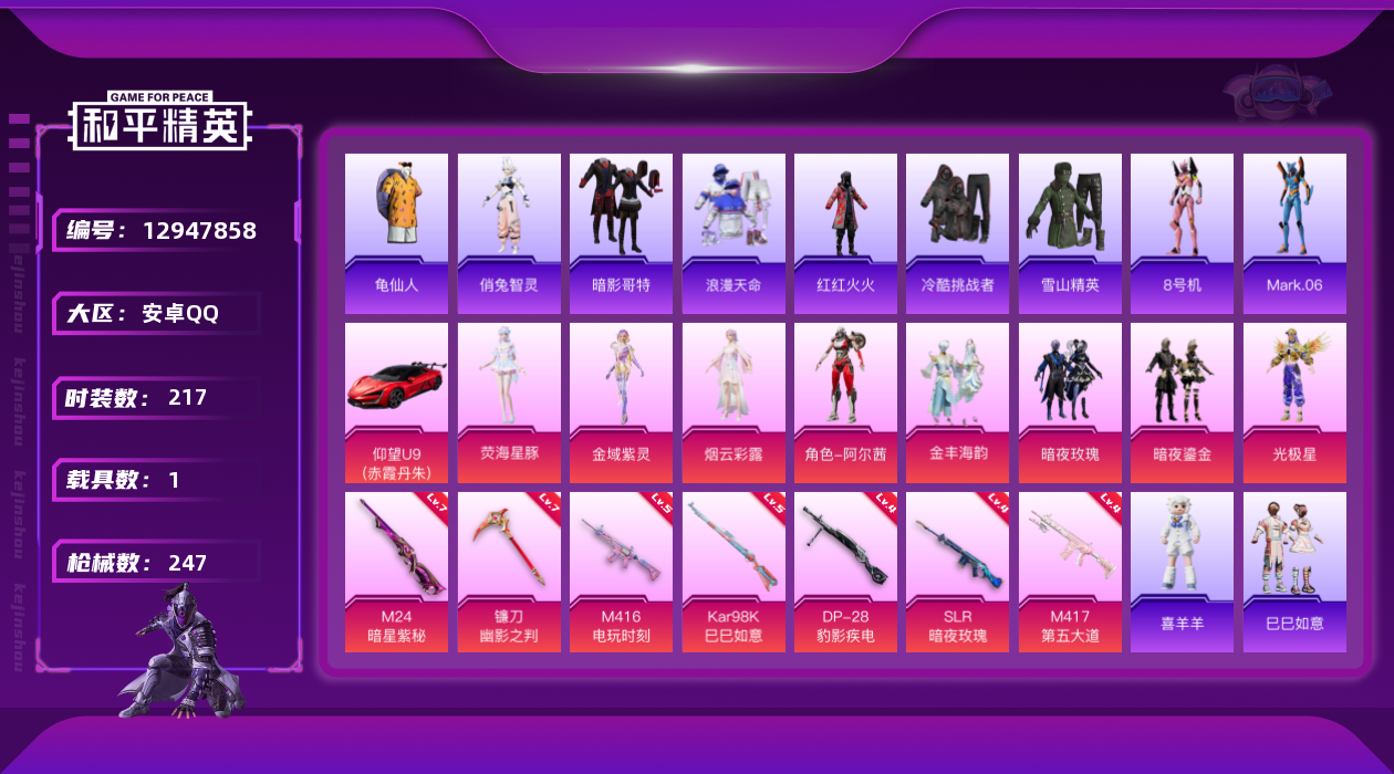 [12947858]【暑期末清货/特价急出/永久包赔】:安卓 手Q-9粉装-7特效枪-1载具-7.8w热力值-7印记-217套装-247枪皮【热门品类】:套装-都市猎人【稀有载具】:仰望U9(赤霞丹朱)【特效枪等级】:M416-电玩时刻(五级),Kar98K-巳巳如意(五级),M24-暗星紫秘(七级),SLR-暗夜玫瑰(四级),M417-第五大道(四级),DP-28-豹影疾电(四级),镰刀-幽影之判(七级)【优质套装】:粉装-梦幻火箭,粉装-暗夜玫瑰,粉装-暗夜鎏金,角色-阿尔茜,角色-烟云彩露,角色-光极星,角色-金域紫灵,粉装-金丰海韵,角色-荧海星豚【优质飞行器】:梦幻火箭飞行器,沙丘之主天马
