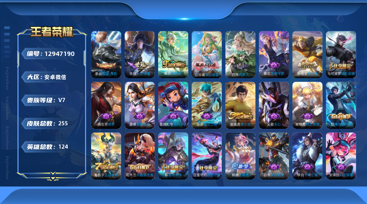 [12947190]发育路36段-安卓WX-V7-永恒钻石II段位-124英雄-255皮肤-1典藏-0珍品无双-0无双-0珍品传说-2传说-67史诗 【英雄全皮】:蒙恬全皮 【荣耀典藏】:李白鸣剑曳影 【传说皮肤】:桑启鸣野蒿,李信一念神魔 【限定皮肤】:白起狰,蔡文姬夏日便利店,虞姬夏日便利店,姜子牙天穹之誓,狄仁杰阴阳师,虞姬凯尔特女王,赵云皇家上将,墨子神迹守卫,嬴政优雅恋人,孙尚香蔷薇恋人,庄周高山流水,高渐离死亡摇滚,阿轲迷踪丽影,钟无艳超时空战士,扁鹊炼金王,扁鹊奇幻香踪,芈月重明,芈月幻夜卜梦,元歌无心,甄姬落雪兰心,曹操烛龙,典韦穷奇,马可波罗暗影游猎,狄仁杰魔术师,狄仁杰万华元夜,达摩沙漠行僧,项羽海滩派对,老夫子醍醐杖,老夫子航海奇遇记,程咬金演武夺筹,刘邦夺宝奇兵,兰陵王金庭之子,孙悟空孙行者,牛魔御旌,后羿圣弓游侠,李元芳银河之约,李元芳云中旅人,钟馗驱傩正仪,杨戬潮玩骑兵,干将莫邪真爱魔法,雅典娜单词大作战,雅典娜黎明之约,蔡文姬繁星吟游,太乙真人饕餮,鬼谷子原初探秘者,鬼谷子五谷丰年,黄忠火炮绅士,苏烈千军破阵,百里玄策原初追逐者,弈星混沌棋,梦奇顽趣,沈梦溪大漠名商,明世隐疑决卦,裴擒虎李小龙,裴擒虎擒涛扼浪,狂铁御狮,米莱狄御霄,盾山御銮,猪八戒西部大镖客,上官婉儿梁祝,嫦娥拒霜思,嫦娥暖冬兔眠,蒙犽狂想玩偶喵,鲁班大师探海日志,桑启海盐诗旅,暃星界游侠,艾琳女武神,张良古海寻踪,蒙恬荣光圣徽,妲己灵卜魔法,鬼谷子天穹祈灯,刘邦剑破天穹,程咬金群星魔术团,刘备异域游侠 【赛季限定】:扁鹊炼金王,白起狰,芈月重明,曹操烛龙,典韦穷奇,狄仁杰万华元夜,达摩沙漠行僧,老夫子醍醐杖,程咬金演武夺筹,兰陵王金庭之子,张良古海寻踪,牛魔御旌,李元芳云中旅人,虞姬凯尔特女王,钟馗驱傩正仪,雅典娜黎明之约,太乙真人饕餮,鬼谷子原初探秘者,苏烈千军破阵,百里玄策原初追逐者,弈星混沌棋,梦奇顽趣,沈梦溪大漠名商,明世隐疑决卦,裴擒虎擒涛扼浪,狂铁御狮,米莱狄御霄,盾山御銮,鲁班大师探海日志,桑启海盐诗旅,鬼谷子天穹祈灯,蒙恬荣光圣徽,刘邦剑破天穹,姜子牙天穹之誓 【战令限定】:墨子神迹守卫,蔡文姬夏日便利店,虞姬夏日便利店,阿轲迷踪丽影,钟无艳超时空战士,扁鹊奇幻香踪,芈月幻夜卜梦,甄姬落雪兰心,马可波罗暗影游猎,老夫子航海奇遇记,刘邦夺宝奇兵,后羿圣弓游侠,李元芳银河之