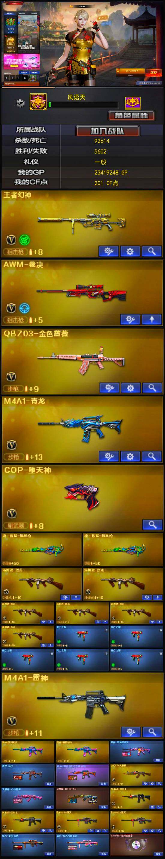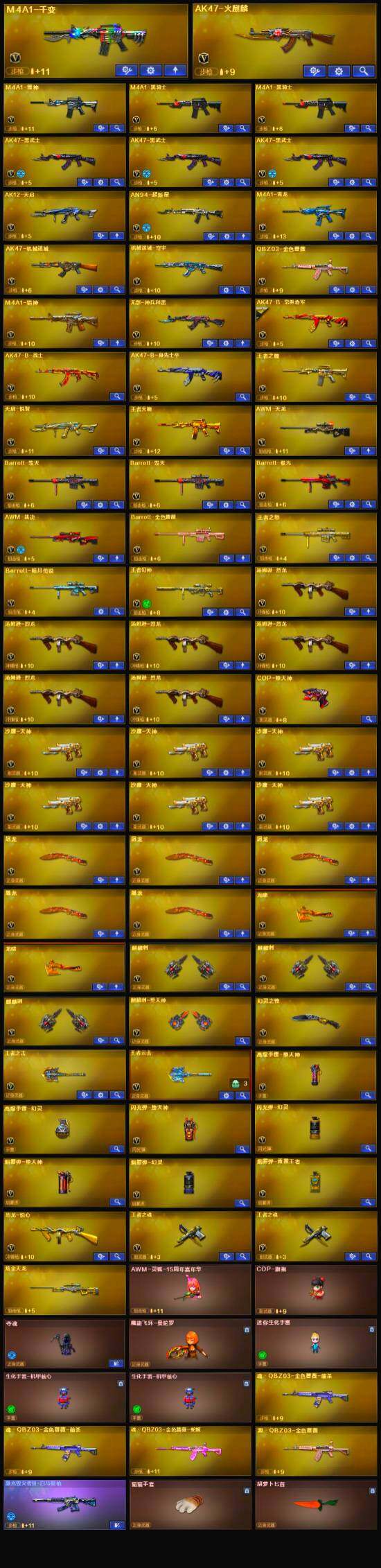 【英雄级武器】:幻灵之锋,COP-堕天神,麒麟刺-堕天神,QBZ03-金色蔷薇,M4A1-青龙,无影-神兵利器,M4A1-雷神,M4A1-黑骑士*2,汤姆逊-烈龙*6,AK47-火麒麟,AK47-黑武士*3,AK12-天启,AN94-超新星,AWM-天龙,Barrett-毁灭*2,Barrett-极光,AWM-裁决,AK47-机械迷城,M4A1-猎神,M4A1-千变,AK-47-猩红传说,AK47-B-常胜将军,M4A1-赤狱骑士,沙鹰-天神*6,麒麟刺*3,龙啸*2,屠龙*5
