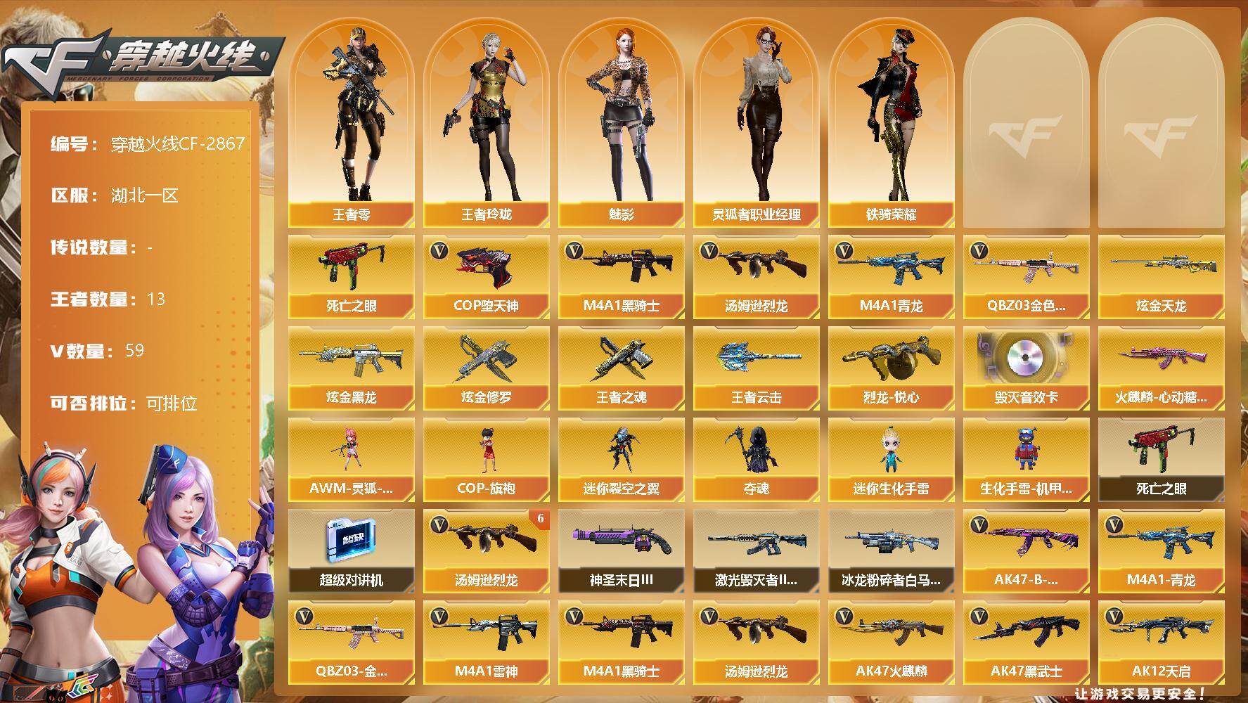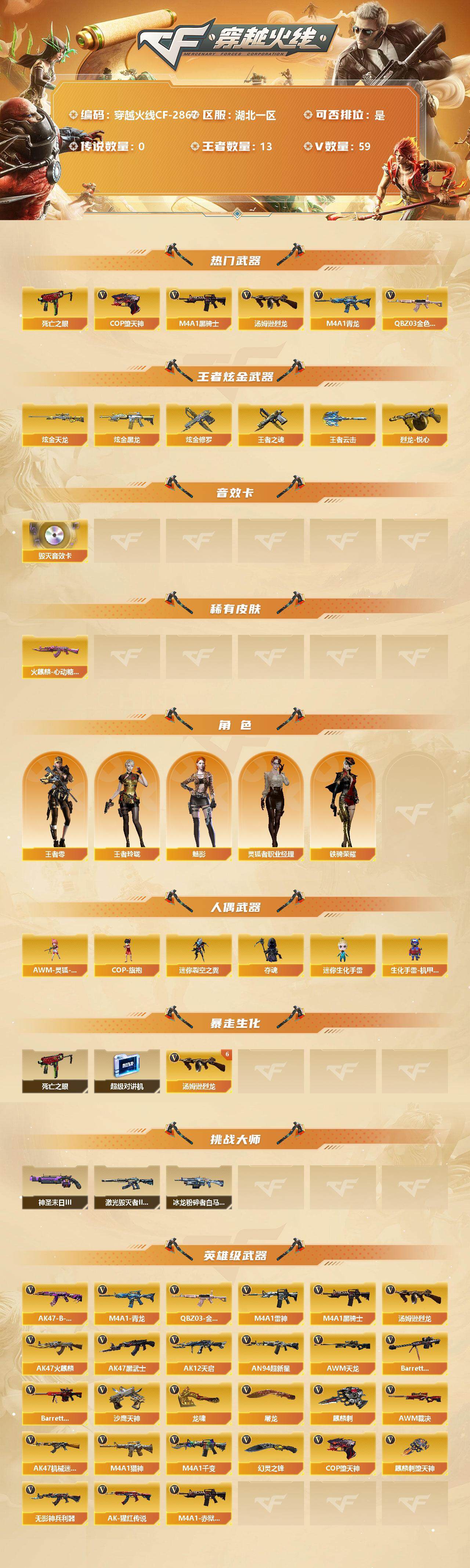 [12946226]湖北一区-59V-13王者-4炫金 【热门武器】:QBZ03-金色蔷薇,M4A1-青龙,死亡之眼*5,M4A1-黑骑士*2,汤姆逊-烈龙*6,COP-堕天神 【王者炫金武器】:炫金天龙,炫金黑龙*2,炫金修罗,烈龙-悦心,王者之魂*2,王者云击 【音效卡】:Barrett-毁灭音效卡 【稀有皮肤】:火麒麟-心动糖果 【角色】:王者-零,王者玲珑,灵狐者-职业经理,魅影,铁骑荣耀 【人偶武器】:AWM-灵狐-15周年嘉年华,COP-旗袍,迷你裂空之翼,夺魂,迷你生化手雷,生化手雷-机甲核心*2 【暴走生化】:死亡之眼*5,超级对讲机 【挑战大师】:神圣爆裂者-末日III,激光毁灭者III-白马银枪,冰龙粉碎者-白马银枪*2 【英雄级武器】:幻灵之锋,COP-堕天神,麒麟刺-堕天神,QBZ03-金色蔷薇,M4A1-青龙,无影-神兵利器,M4A1-雷神,M4A1-黑骑士*2,汤姆逊-烈龙*6,AK47-火麒麟,AK47-黑武士*3,AK12-天启,AN94-超新星,AWM-天龙,Barrett-毁灭*2,Barrett-极光,AWM-裁决,AK47-机械迷城,M4A1-猎神,M4A1-千变,AK-47-猩红传说,AK47-B-常胜将军,M4A1-赤狱骑士,沙鹰-天神*6,麒麟刺*3,龙啸*2,屠龙*5 【特殊枪械】:2黑骑士,6烈龙