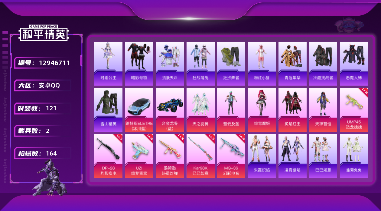 - [11438911]【商品标题】:安卓 手Q-4粉装-4特效枪-0载具-48258热力值-9印记-121套装-174枪皮 【特效枪等级】:AKM-绿萝繁花(五级),SCAR-L-锦绣绵绵(五级),Kar98K-巳巳如意(五级),DP-28-暗夜鎏金(七级) 【优质套装】:粉装-星之信仰,粉装-苍蓝魅影,粉装-银刃赛罗,粉装-暗夜鎏金 【优质武器皮肤】:AKM-绿萝繁花,SCAR-L-锦绣绵绵,Kar98K-巳巳如意,DP-28-暗夜鎏金 【稀有武器皮肤】:AKM-冰凉西瓜,AKM-夜灯,AKM-彩虹符号,AKM-灼热熔岩,AKM-生命誓言,AKM-虎虎生威,AKM-锦绣火鲤,AKM-霓虹街区,AKM-龙的传人,M16A4-夜灯,M16A4-幻世战舞者,M16A4-快乐主宰,M16A4-甜心亚梦,M16A4-魔法学院,M16A4-龙虾霸霸,SCAR-L-夏日绵绵冰,SCAR-L-炫彩节奏,SCAR-L-玉兔迎春,SCAR-L-红色方程式,SCAR-L-黄金龙骨,M416-夜灯,M416-神秘黑猫,M416-糯团青竹,M416-绯红前夜,GROZA-彩虹符号,GROZA-懵萌河马,GROZA-治愈之星,GROZA-田园牧歌,GROZA-紫翼圣骑,AUG-天降萌叽,AUG-耀粉歌者,QBZ-原初圣火,QBZ-彩虹符号,QBZ-飞驰魅影,M762-天降萌叽,M762-奇异狩猎者,M762-暗夜鎏金,M762-牛气冲天,M762-绯红前夜,M762-镭射皇者,G36C-懵萌河马,G36C-金风玉露,AC-VAL-天降萌叽,AC-VAL-快闪甜心,AC-VAL-甜心亚梦,AC-VAL-闲梦青缨,蜜獾-天降萌叽,UZI-啾咪啾咪,UZI-天降萌叽,UZI-炫彩节奏,UZI-红色方程式,UMP45-快乐主宰,UMP45-春暖花开,Vector-彩虹符号,Vector-暗夜玫瑰,Vector-治愈之星,Vector-生命誓言,Vector-田园牧歌,Vector-龙虾霸霸,汤姆逊-勇闯险境,汤姆逊-奇异狩猎者,汤姆逊-暗夜鎏金,汤姆逊-环太平洋,P90-倾城蜜语,P90-快闪甜心,P90-飞驰魅影,P90-巳巳如意,Kar98K-勇闯险境,Kar98K-彩虹符号,Kar98K-飞驰魅影,M24-治愈之星,M24-奇异狩猎者,AWM-圣堂之誓,SKS-勇闯险境,VSS-彩虹符号,VSS-星之彼岸,VSS