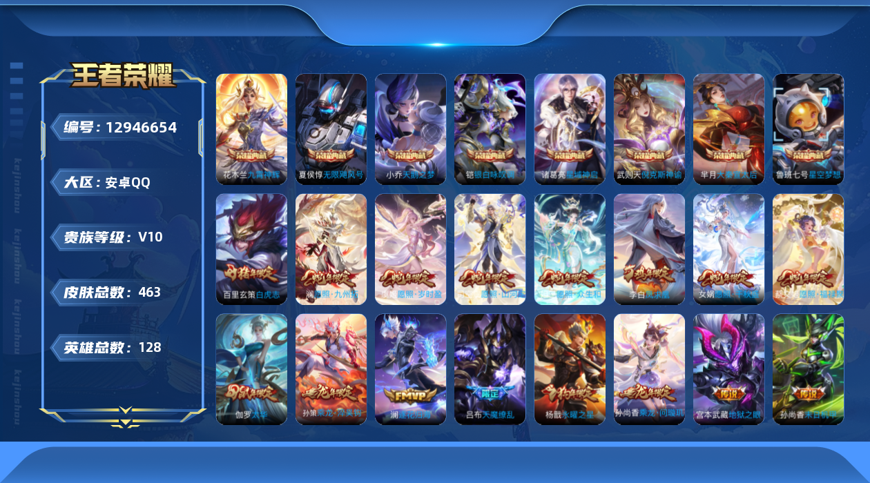 [12946654]暑期末清货/特价急出/永久包赔对抗路33段/打野31段:安卓Q-V10-最强王者段位-126英雄-459皮肤-8典藏-38传说-140史诗 【荣耀典藏】:武则天英雄,武则天倪克斯神谕,夏侯惇无限飓风号,小乔天鹅之梦,鲁班七号星空梦想,芈月大秦宣太后,诸葛亮星域神启,花木兰九霄神辉,铠银白咏叹调 【内测皮肤】:艾琳女武神,高渐离玩趣恶龙,狂铁特工战影 【传说皮肤】:狄仁杰超时空战士,武则天海洋之心,吕布天魔缭乱,孙悟空地狱火,宫本武藏地狱之眼,孙尚香末日机甲,李白凤求凰,貂蝉仲夏夜之梦,诸葛亮武陵仙君,杨戬永曜之星,后羿黄金射手座,梦奇胖达荣荣,花木兰冠军飞将,百里玄策白虎志,达摩黄金狮子座,虞姬云霓雀翎,干将莫邪久胜战神,张良黄金白羊座,伽罗太华,刘备时之恋人,李信一念神魔,曜云鹰飞将,虞姬启明星使,王昭君乞巧织情,孙尚香异界灵契,艾琳觅芳踪,澜逐花归海,赵云乘龙铭钟鼎,孙策乘龙淬吴钩,孙尚香乘龙问璇玑,桑启鸣野蒿,云缨幻光神枪,虞姬愿照岁时盈,蔡文姬愿照福禄聚,澜愿照九州拓,妲己愿照众生和,女娲愿照千秋盛,司空震愿照山河定 【限定皮肤】:白起狰,蒙犽顽岩魄,大乔绒语心约,姜子牙天穹之誓,杨戬破阵退雄兵,狄仁杰阴阳师,虞姬凯尔特女王,赵云皇家上将,墨子神迹守卫,妲己热情桑巴,妲己时之彼端,嬴政白昼王子,孙尚香异界灵契,庄周蜃楼王,庄周云端筑梦师,庄周玄嵩,庄周高山流水,高渐离死亡摇滚,高渐离玩趣恶龙,阿轲迷踪丽影,钟无艳王者之锤,孙膑妖精王,扁鹊炼金王,扁鹊奇幻香踪,白起夜都怪侠,芈月重明,芈月幻夜卜梦,吕布天魔缭乱,吕布猎兽之王,周瑜真爱至上,周瑜赤莲之焰,元歌云间偶戏,夏侯惇朔风刀,甄姬幽恒,甄姬游园惊梦,曹操烛龙,曹操天狼征服者,典韦穷奇,典韦岱宗,马可波罗逐梦之星,马可波罗暗影游猎,狄仁杰魔术师,狄仁杰万华元夜,达摩星际陆战队,达摩沙漠行僧,项羽海滩派对,项羽霸王别姬,老夫子圣诞老人,老夫子醍醐杖,老夫子航海奇遇记,关羽冰锋战神,貂蝉逐梦之音,程咬金演武夺筹,露娜一生所爱,刘邦夺宝奇兵,韩信逐梦之影,韩信飞衡,韩信傲雪梅枪,王昭君午后时光,兰陵王驯魔猎人,兰陵王金庭之子,花木兰青春决赛季,亚瑟狮心王,亚瑟潮玩骑士王,孙悟空美猴王,孙悟空至尊宝,孙悟空大圣娶亲,后羿辉光之辰,后羿圣弓游侠,李元芳银河之约,李元芳云中旅人,虞姬霸王别姬,虞姬启明星使,钟馗驱傩正