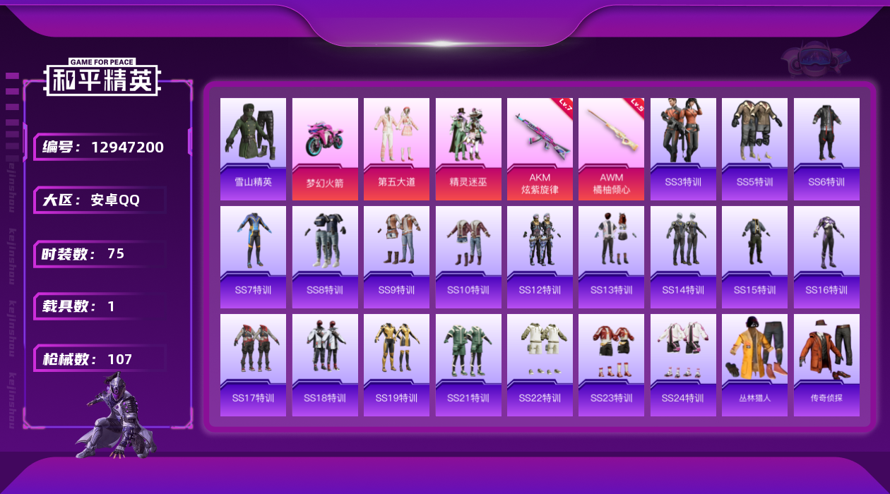[12947200]【暑期末清货/特价急出/永久包赔】:安卓 手Q-2粉装-2特效枪-1载具-3.6w热力值-5印记-75套装-107枪皮【稀有载具】:双人摩托-梦幻火箭【特效枪等级】:AKM-炫紫旋律(七级),AWM-橘柚倾心(五级)【优质套装】:粉装-精灵迷巫,粉装-第五大道【优质飞行器】:深海曼妙飞行器,梦幻火箭飞行器