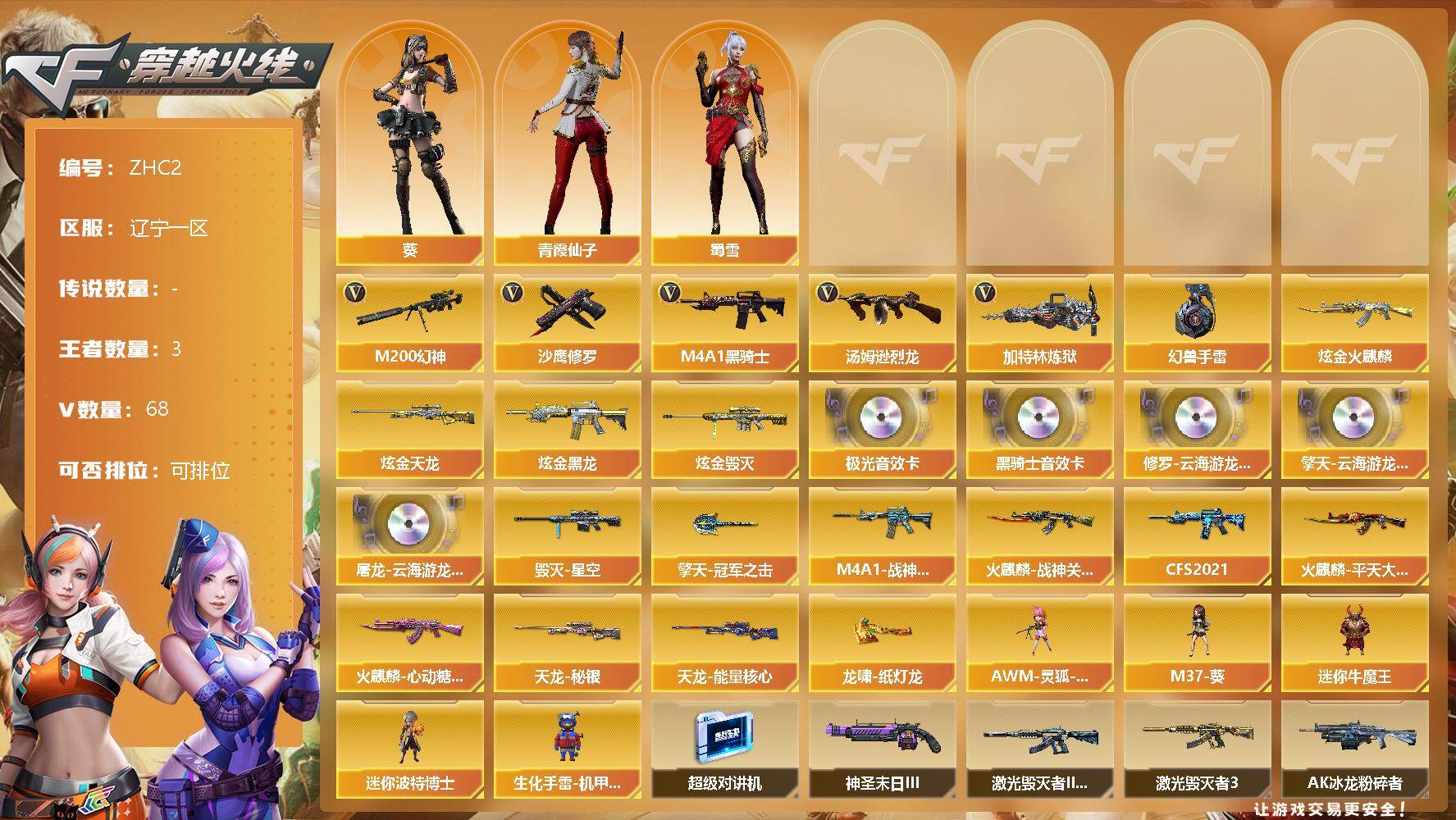 [12947948]【特价急出/详情看图】:辽宁一区-68V-3王者-4炫金 【热门武器】:M200-幻神,M4A1-黑骑士*2,汤姆逊-烈龙*3,加特林-炼狱*2,沙鹰-修罗*3,高爆手雷-幻兽 【王者炫金武器】:炫金火麒麟,炫金天龙,炫金黑龙,炫金毁灭 【音效卡】:修罗-云海游龙音效卡,擎天-云海游龙音效卡,屠龙-云海游龙音效卡,M4A1-黑骑士音效卡,Barrett-极光音效卡 【稀有皮肤】:M4A1-战神赵云,火麒麟-战神关羽,火麒麟-平天大圣,火麒麟-心动糖果,黑骑士-CFS2021,毁灭-星空,天龙-秘银,天龙-能量核心,擎天-冠军之击,龙啸-纸灯龙皮肤 【角色】:葵,蜀雪,青霞仙子 【人偶武器】:AWM-灵狐-15周年嘉年华,M37-葵,迷你牛魔王,迷你波特博士,生化手雷-机甲核心 【暴走生化】:超级对讲机 【挑战大师】:神圣爆裂者-末日III,阐释者III,激光毁灭者III,激光毁灭者III-白马银枪,AK47-冰龙粉碎者,冰龙粉碎者-白马银枪 【英雄级武器】:烟雾弹-竞技荣光,闪光弹-竞技荣光,幻灵之锋,斩神刀-雷暴,沙鹰-幻兽,女皇利刃-幻兽,烈火-动感闪耀,天神-动感闪耀,屠龙-动感闪耀,手雷-动感闪耀,M4A1-雷神*2,M4A1-黑龙,M4A1-黑骑士*2,M4A1-死神*2,加特林-炼狱*2,汤姆逊-烈龙*3,AK47-火麒麟*6,AK47-黑武士,AK12-天启,AWM-天龙,Barrett-毁灭*3,Barrett-极光*2,M4A1-龙血,AA-12-雷霆,M200-幻神,AK47-黑鲨,黑武士-锦绣游龙,沙鹰-天神,沙鹰-修罗*3,麒麟刺,擎天,龙啸,屠龙,擎天-云海游龙,高爆手雷-幻兽 【特殊枪械】:2黑骑士,3烈龙,2炼狱