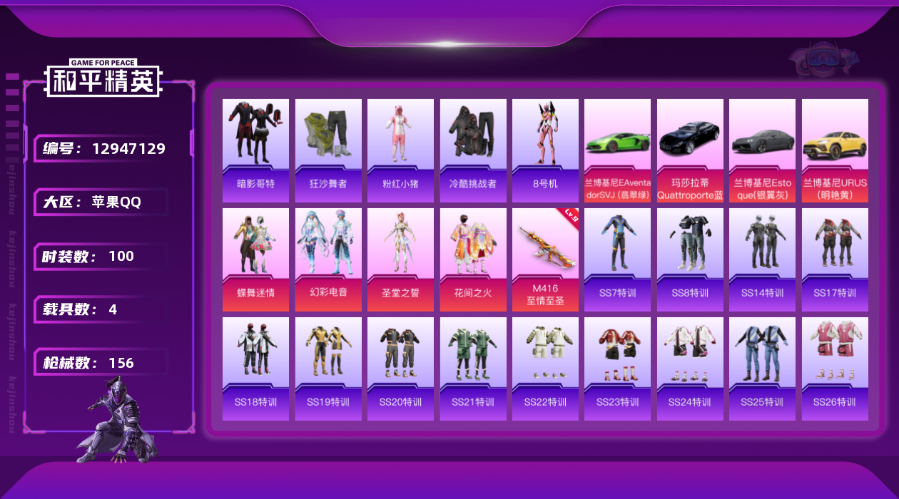 [12947129]M416-至情至圣(九级)【暑期末清货/特价急出/永久包赔】:苹果 手Q-4粉装-2特效枪-4载具-4.9w热力值-9印记-100套装-156枪皮【热门品类】:套装-胖达圆圆【稀有载具】:兰博基尼Aventador SVJ(翡翠绿),兰博基尼Estoque(银翼灰),兰博基尼URUS(明艳黄),玛莎拉蒂Quattroporte(夜幕蓝)【特效枪等级】:M416-至情至圣(九级)【优质套装】:粉装-蝶舞迷情,粉装-花间之火,角色-圣堂之誓,粉装-幻彩电音【优质飞行器】:太空嘟嘟飞行器