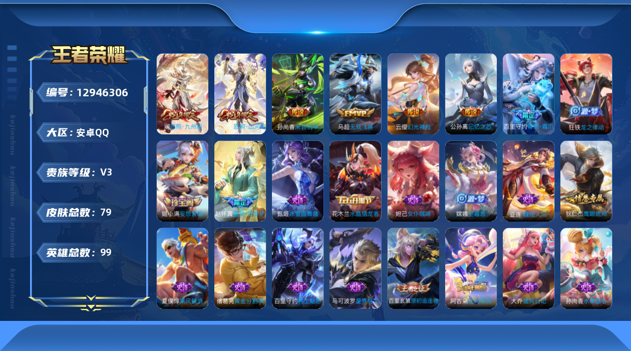 [12946306]暑期末清货/特价急出/永久包赔:安卓Q-V3-最强王者段位-99英雄-79皮肤-6传说-26史诗