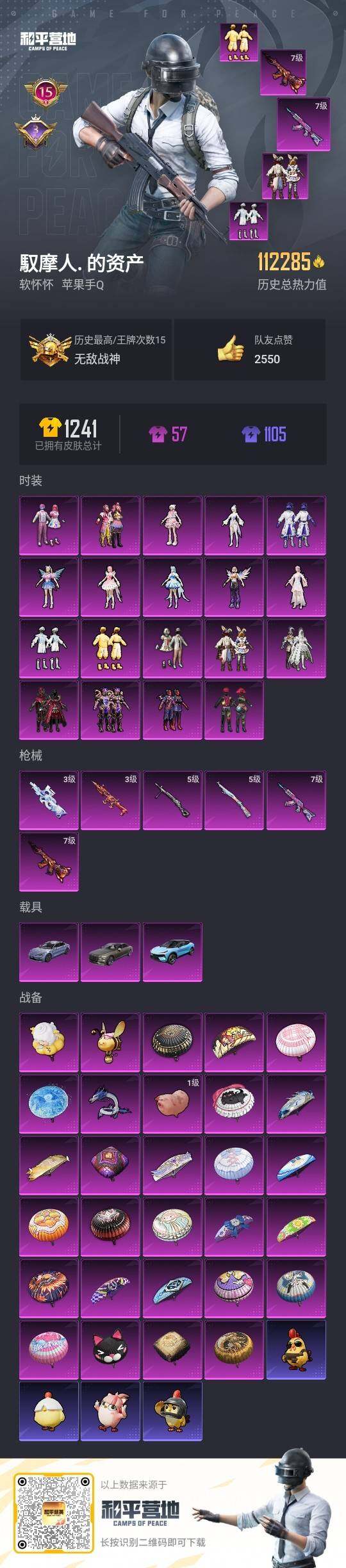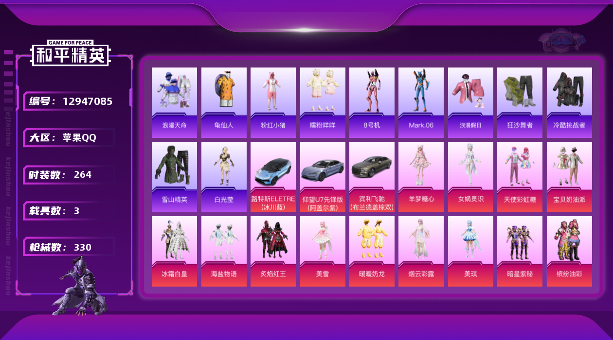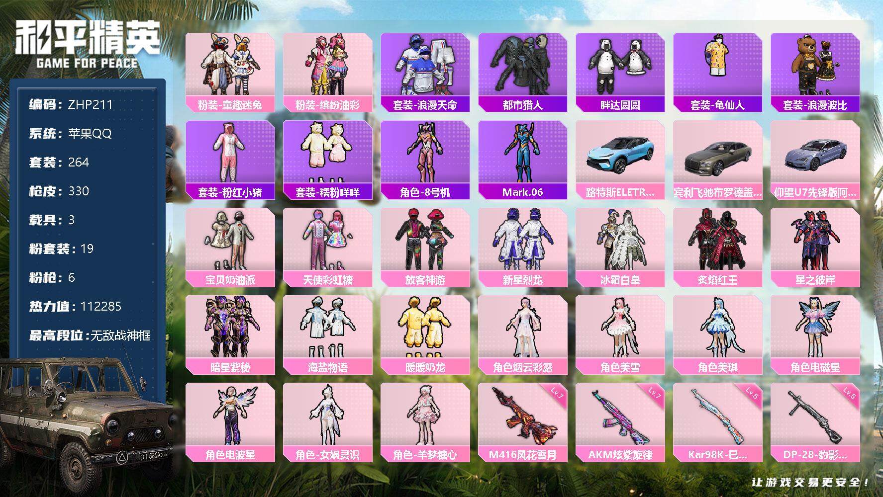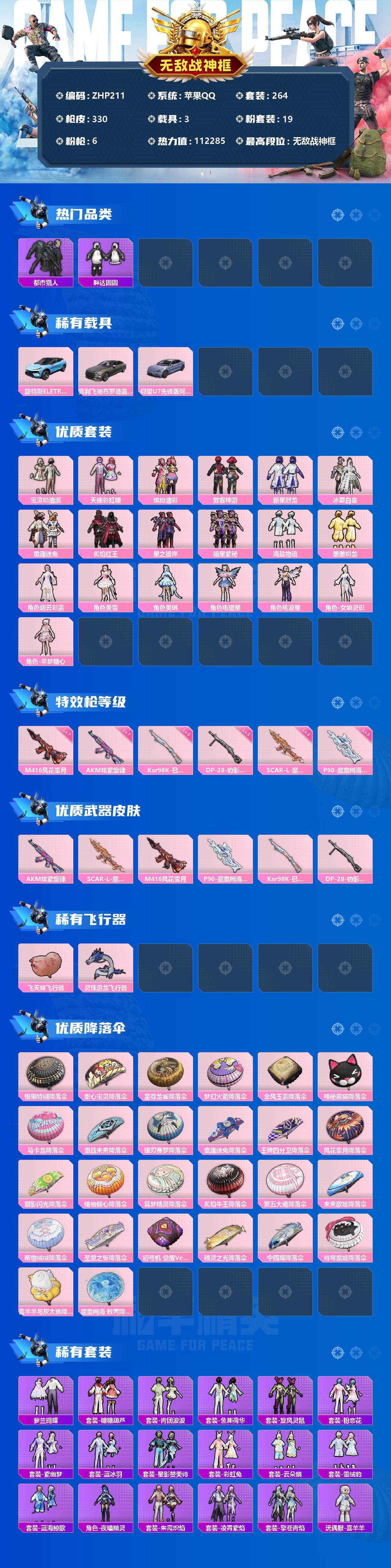 [12947085]苹果 手Q-无敌战神框-19粉装-6特效枪-3载具-3粉色飞行器-112285热力值-15王牌印记-264套装-330枪皮
