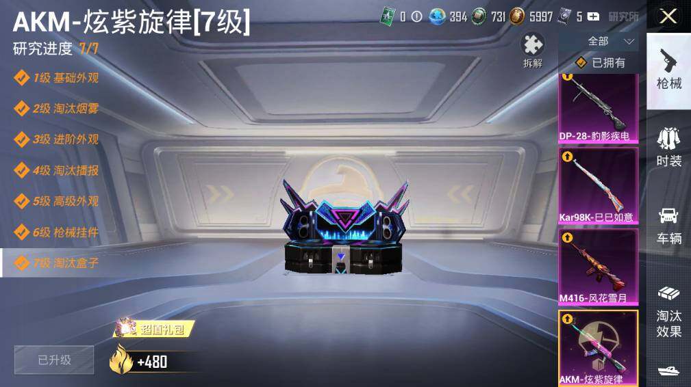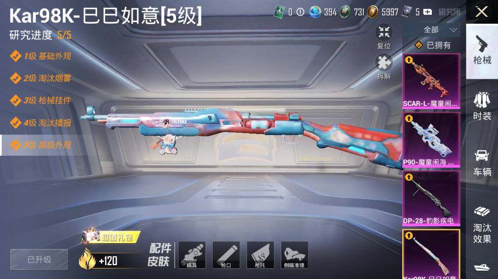 【粉色枪皮等级】:AKM-炫紫旋律(七级),SCAR-L-魔童闹海 哪吒(三级),M416-风花雪月(七级),P90-魔童闹海 敖丙(三级),Kar98K-巳巳如意(五级),DP-28-豹影疾电(五级)