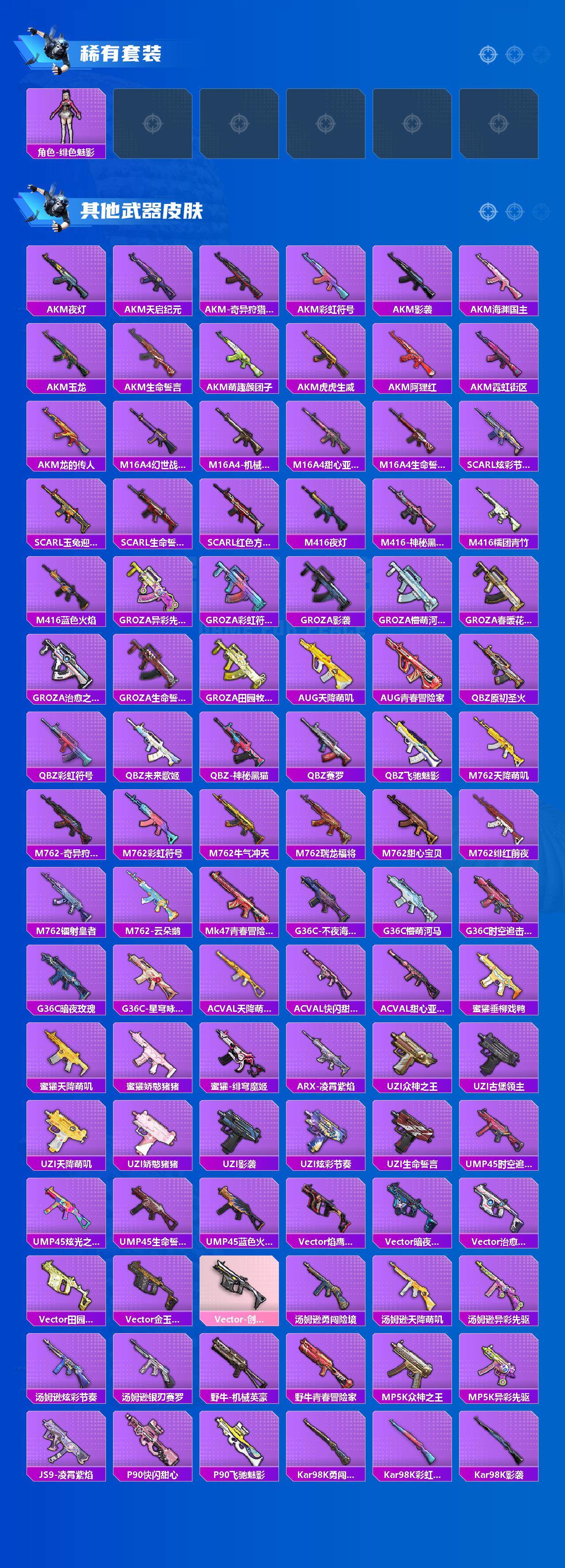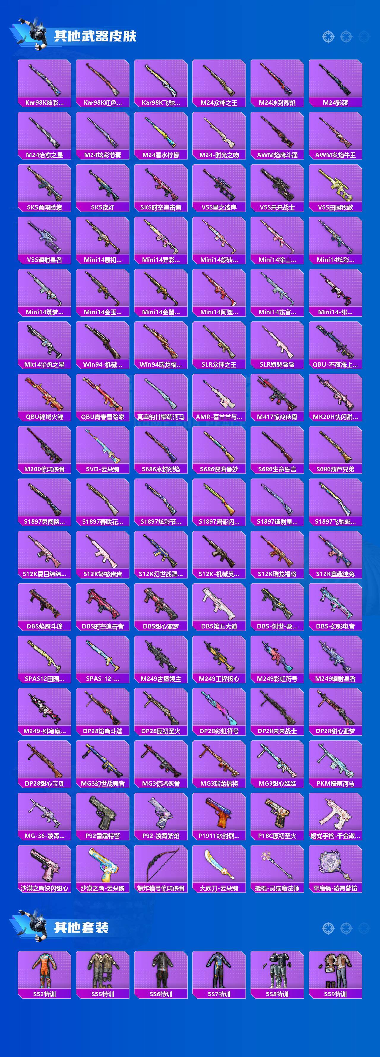 [12947085]苹果 手Q-无敌战神框-19粉装-6特效枪-3载具-3粉色飞行器-112285热力值-15王牌印记-264套装-330枪皮 【热门品类】:粉装-童趣迷兔,粉装-缤纷油彩,套装-浪漫天命,套装-都市猎人,套装-胖达圆圆,套装-龟仙人,套装-浪漫波比,套装-粉红小猪,套装-糯粉咩咩,角色-8号机,角色-Mark.06 【粉色载具】:路特斯ELETRE(冰川蓝),宾利飞驰(布罗德盖棕双色),仰望U7(阿盖尔紫) 【粉色套装】:战神框!粉装-宝贝奶油派,粉装-天使彩虹糖,粉装-缤纷油彩,粉装-放客神游,粉装-新星烈龙,粉装-冰霜白皇,粉装-童趣迷兔,粉装-炙焰红王,粉装-星之彼岸,粉装-暗星紫秘,粉装-海盐物语,粉装-暖暖奶龙,角色-烟云彩露,角色-美雪,角色-美琪,角色-电磁星,角色-电波星,角色-女娲灵识,角色-羊梦糖心 【粉色枪皮等级】:AKM-炫紫旋律(七级),SCAR-L-魔童闹海 哪吒(三级),M416-风花雪月(七级),P90-魔童闹海 敖丙(三级),Kar98K-巳巳如意(五级),DP-28-豹影疾电(五级) 【粉色枪皮】:AKM-炫紫旋律,SCAR-L-魔童闹海 哪吒,M416-风花雪月,P90-魔童闹海 敖丙,Kar98K-巳巳如意,DP-28-豹影疾电 【粉色飞行器】:飞天猪飞行器,灵珠游龙飞行器 【粉色降落伞】:极限特训降落伞,甜心宝贝降落伞,至尊龙雀降落伞,梦幻火箭降落伞,金风玉露降落伞,神秘黑猫降落伞,马卡龙降落伞,激战未来降落伞,银刃赛罗降落伞,童趣迷兔降落伞,王牌四分卫降落伞,风花雪月降落伞,碧影闪光降落伞,橘柚倾心降落伞,筑梦精灵降落伞,炙焰牛王降落伞,第五大道降落伞,未来歌姬降落伞,萌物绒绒降落伞,圣堂之誓降落伞,初号机 觉醒Ver.降落伞,精灵之光降落伞,宁雨蝶降落伞,绯穹魔姬降落伞,喜羊羊与灰太狼降落伞,魔童闹海 敖丙降落伞 【稀有套装】:套装-龟仙人,套装-萝兰蝴蝶,套装-糖糖葫芦,套装-青团波波,套装-鱼渊荷华,套装-旋风灵鼠,套装-粉恋花,套装-紫幽梦,套装-蓝冰羽,套装-星影赞美诗,套装-彩虹兔,套装-云朵鹅,套装-雪绒豹,套装-蓝海鲸歌,角色-夜瞳黯灵,套装-朱霞炽焰,套装-凌霄紫焰,套装-擎苍青焰,玩偶服-喜羊羊,角色-绯色魅影 【稀有枪皮】:AKM-夜灯,AKM-天启纪元,AKM-奇异狩猎者,AKM-彩虹符号,AKM-