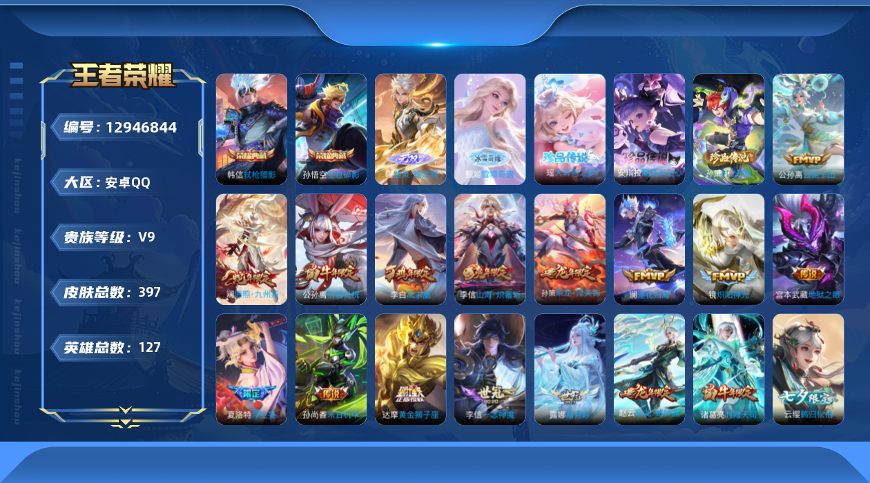 [12946844]【特价急出/详情看图】:安卓Q-V9-至尊星耀V段位-126英雄-397皮肤-2典藏-2无双-3珍品传说-51传说-130史诗