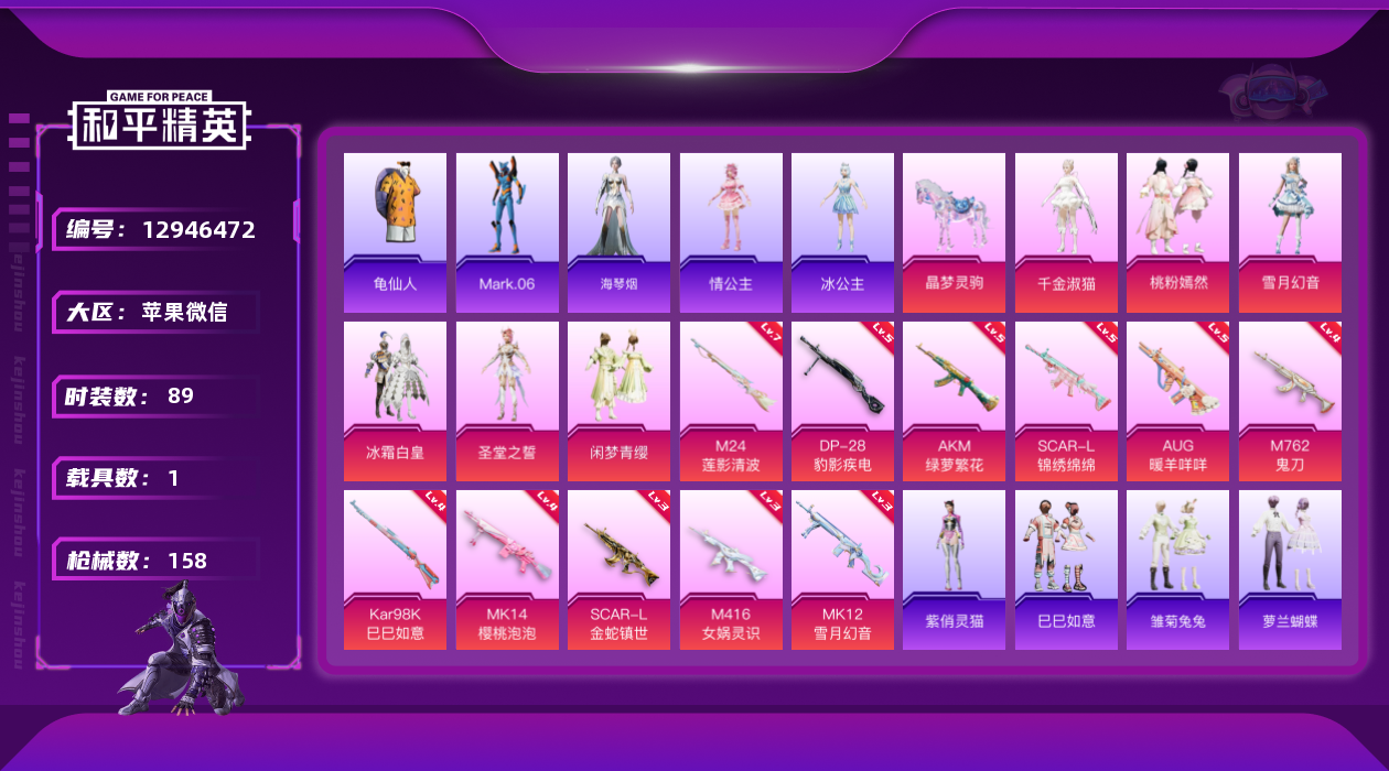 [12946472]【特价急出/详情看图】::苹果 微信-6粉装-11特效枪-1载具-4粉色飞行器-49376热力值-9王牌印记-89套装-158枪皮 【热门品类】:套装-龟仙人,角色-Mark.06 【粉色载具】:晶梦灵驹 【粉色套装】:粉装-冰霜白皇,粉装-闲梦青缨,角色-圣堂之誓,角色-千金淑猫,粉装-桃粉嫣然,粉装-雪月幻音 【粉色枪皮等级】:AKM-绿萝繁花(五级),SCAR-L-锦绣绵绵(五级),SCAR-L-金蛇镇世(三级),M416-女娲灵识(三级),AUG-暖羊咩咩(五级),M762-鬼刀(四级),Kar98K-巳巳如意(四级),M24-莲影清波(七级),Mk14-樱桃泡泡(四级),MK12-雪月幻音(三级),DP-28-豹影疾电(五级) 【粉色枪皮】:AKM-绿萝繁花,SCAR-L-锦绣绵绵,SCAR-L-金蛇镇世,M416-女娲灵识,AUG-暖羊咩咩,M762-鬼刀,Kar98K-巳巳如意,M24-莲影清波,Mk14-樱桃泡泡,MK12-雪月幻音,DP-28-豹影疾电 【粉色飞行器】:龙翔九天飞行器,凤舞九天飞行器,万象金身飞行器,圣域金龙飞行器 【粉色降落伞】:神秘黑猫降落伞,齐天大圣降落伞,恐龙拽拽降落伞,莲影清波降落伞,镜光幻境降落伞,圣堂之誓降落伞,江南烟雨降落伞,精灵梦叶罗丽降落伞,创世·救赎降落伞,忍者神龟降落伞,盛世惊鸿降落伞,金蛇镇世降落伞,晶梦幻蝶降落伞,樱桃泡泡降落伞 【稀有套装】:套装-龟仙人,套装-巳巳如意,套装-雏菊兔兔,套装-萝兰蝴蝶,角色-米开朗基罗,套装-糖糖葫芦,套装-青团波波,套装-燕燕于飞,套装-鱼渊荷华,角色-海琴烟,套装-晶灵使者,角色-糖霜甜心,角色-蜜桃派对,套装-紫幽梦,套装-蓝冰羽,套装-星影赞美诗,角色-紫俏灵猫 【稀有枪皮】:AKM-恐龙拽拽,AKM-龙的传人,SCAR-L-夜灯,SCAR-L-玉兔迎春,SCAR-L-红色方程式,M416-摩登王国,M416-绯红前夜,GROZA-恐龙拽拽,GROZA-懵萌河马,GROZA-晶梦幻蝶,AUG-圣光天使,AUG-耀粉歌者,AUG-金蛇镇世,G36C-懵萌河马,G36C-桃粉嫣然,AC-VAL-天降萌叽,AC-VAL-快闪甜心,蜜獾-千面幻镜,蜜獾-天降萌叽,Famas-镜域双华,UZI-啾咪啾咪,UMP45-繁龙极客,UMP45-涂山之恋,UMP45-绒宝小鹅,