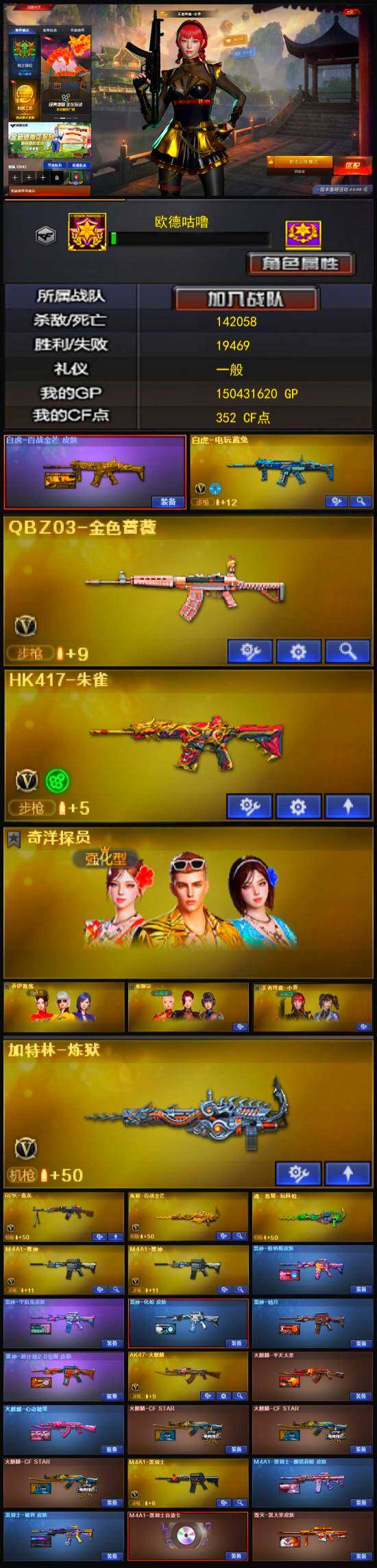 【热门武器】:QBZ03-金色蔷薇,HK417-朱雀,金色蔷薇-古蛇迷踪,修罗-古蛇迷踪,白虎-电玩蓝兔,M4A1-黑骑士,RPK-盘龙,加特林-炼狱,沙鹰-修罗*5
