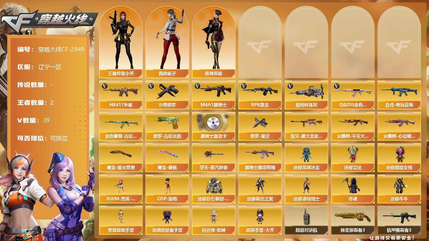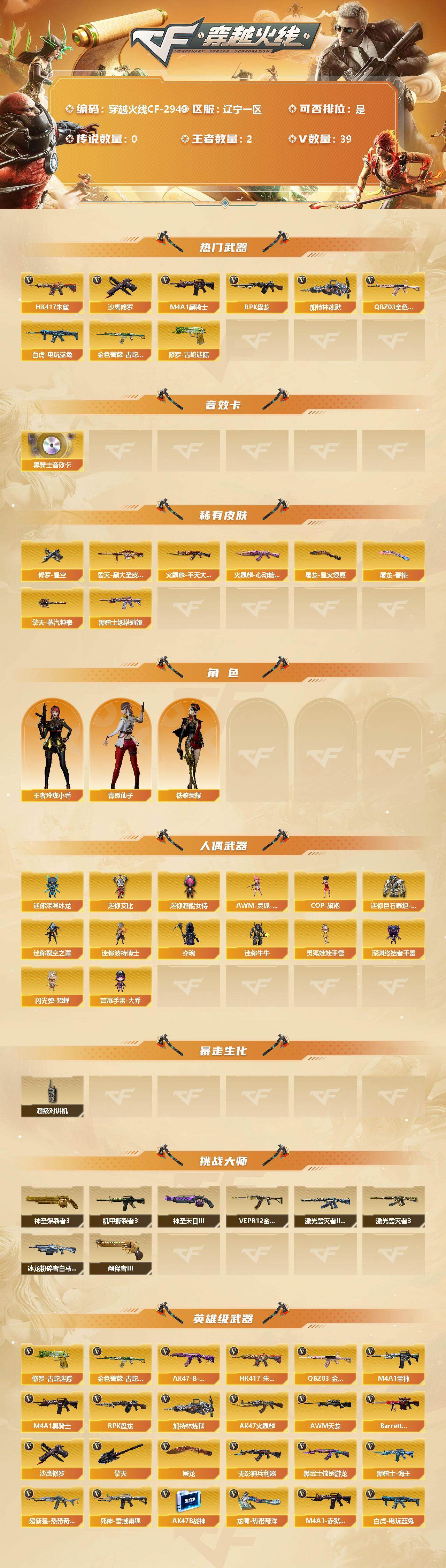 [12946841]辽宁一区-39V-2王者-0炫金 【热门武器】:QBZ03-金色蔷薇,HK417-朱雀,金色蔷薇-古蛇迷踪,修罗-古蛇迷踪,白虎-电玩蓝兔,M4A1-黑骑士,RPK-盘龙,加特林-炼狱,沙鹰-修罗*5 【音效卡】:M4A1-黑骑士音效卡 【稀有皮肤】:火麒麟-平天大圣,火麒麟-心动糖果,M4A1-黑骑士-娜塔莉娅 皮肤,毁灭-黑大圣皮肤,修罗-星空,屠龙-星火燎原,屠龙-春桃 皮肤,擎天-蒸汽钟表 皮肤 【角色】:王者玲珑-小乔,铁骑荣耀,青霞仙子 【人偶武器】:AWM-灵狐-15周年嘉年华,COP-旗袍,迷你深渊冰龙,迷你艾比,迷你超能女侍,迷你巨石泰坦-魔花研究所,迷你裂空之翼,迷你波特博士,夺魂*3,迷你牛牛*3,灵狐娃娃手雷,深渊终结者手雷*2,闪光弹-貂蝉,高爆手雷-大乔 【暴走生化】:超级对讲机 【挑战大师】:神圣爆裂者III,机甲撕裂者III,神圣爆裂者-末日III*2,阐释者III,激光毁灭者III,VEPR-12-金魔,激光毁灭者III-白马银枪,冰龙粉碎者-白马银枪*3 【英雄级武器】:QBZ03-金色蔷薇,HK417-朱雀,金色蔷薇-古蛇迷踪,白虎-电玩蓝兔,无影-神兵利器,M4A1-雷神*2,M4A1-黑骑士,RPK-盘龙,加特林-炼狱,AK47-火麒麟,AWM-天龙,Barrett-极光,黑武士-锦绣游龙,黑骑士-海王*2,超新星-热带奇洋,死神-雪域霜狐,AK47-B-战神,AK47-B-常胜将军,M4A1-赤狱骑士,修罗-古蛇迷踪,沙鹰-修罗*5,擎天,屠龙*4,龙啸-热带奇洋 【特殊枪械】:1黑骑士,1盘龙,1炼狱