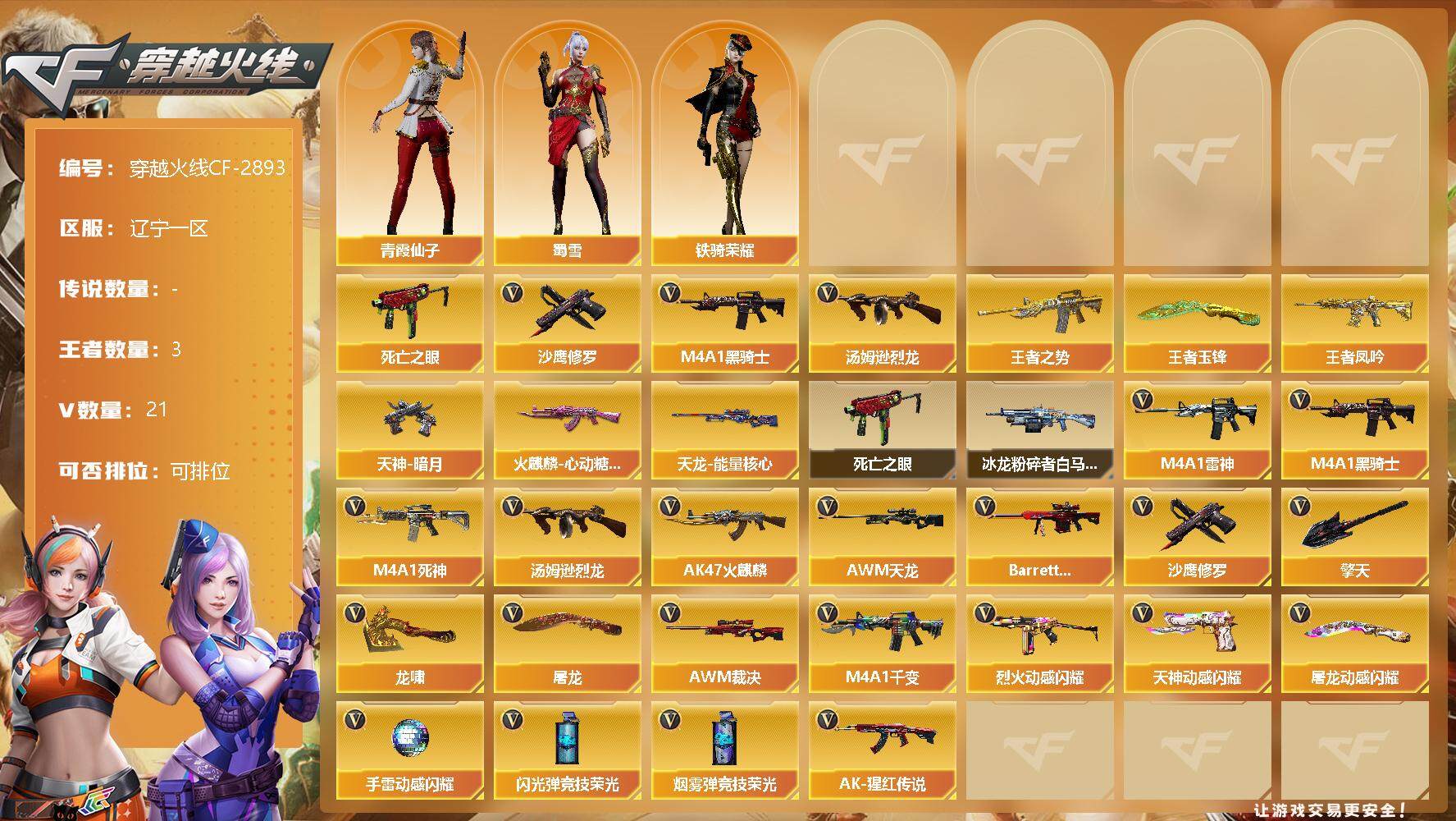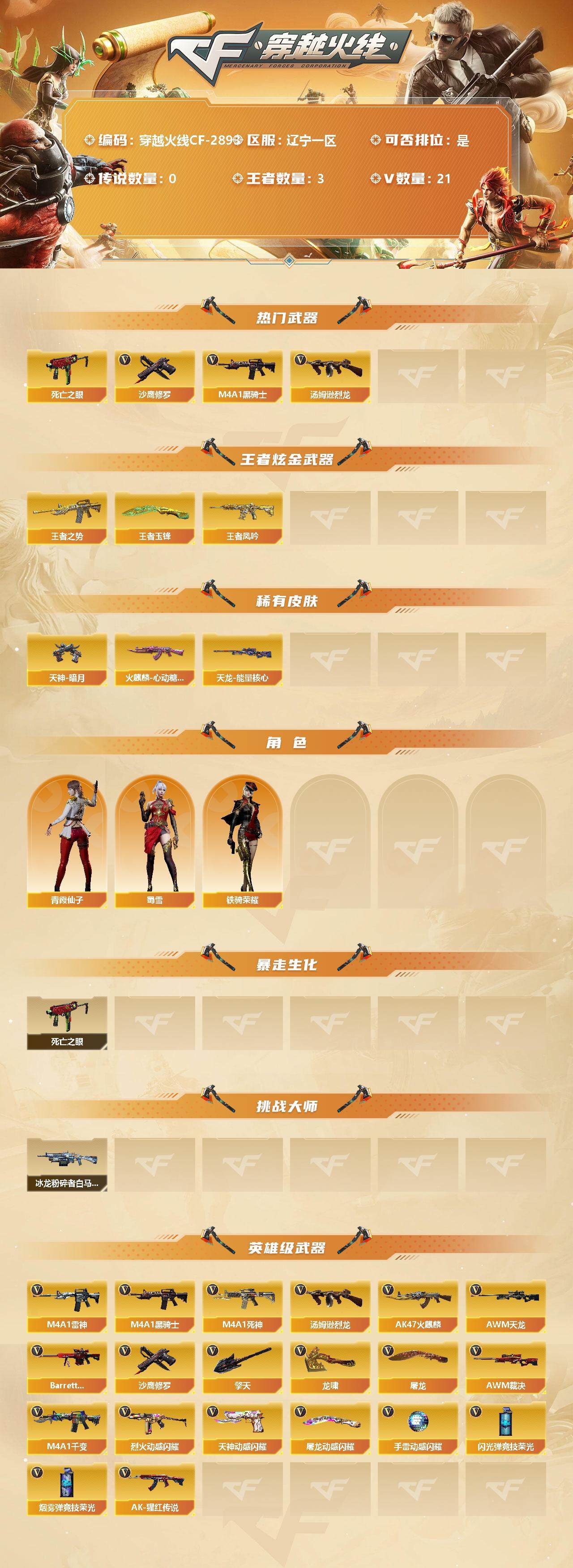 [12946406]辽宁一区-21V-3王者-0炫金 【热门武器】:死亡之眼,M4A1-黑骑士,汤姆逊-烈龙,沙鹰-修罗 【王者炫金武器】:王者之势,王者凤吟,王者玉锋 【稀有皮肤】:火麒麟-心动糖果,天龙-能量核心,天神-暗月*2 【角色】:蜀雪,铁骑荣耀,青霞仙子 【暴走生化】:死亡之眼 【挑战大师】:冰龙粉碎者-白马银枪 【英雄级武器】:烟雾弹-竞技荣光,闪光弹-竞技荣光,烈火-动感闪耀,天神-动感闪耀,屠龙-动感闪耀,手雷-动感闪耀,M4A1-雷神,M4A1-黑骑士,M4A1-死神,汤姆逊-烈龙,AK47-火麒麟,AWM-天龙,Barrett-极光,AWM-裁决,M4A1-千变,AK-47-猩红传说,沙鹰-修罗,擎天,龙啸,屠龙*2 【特殊枪械】:1黑骑士,1烈龙
