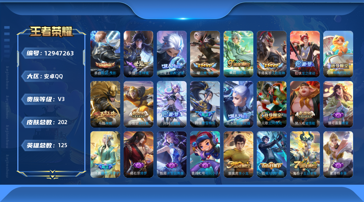 - [11414631]V7 12传说 123英雄 205皮肤 可修改实名 女号 优质装备:一念神魔,音你心动-周瑜,时之恋人-刘备(电焊工),超时空战士-狄仁杰,无双飞将,山海·炽霜斩(李信年限),山海·苍雷引(电光曜子),浮生妄,琥珀纪元铠 珍宝阁皮:妄想食味 限定皮:逐霄战戟,鸣野蒿,至尊宝,傲雪梅枪,无限倾心-项羽,齐天大圣,五谷丰年,岱宗(典韦年限),李小龙,孙行者,时之奇旅-妲己,梦圆繁星,山海·玄木吟(马可年限) 史诗皮:器灵·浮梦炉,谪仙醉月,破空之剑,战舞者,东方月初,琥珀纪元伽罗,紫霞仙子,特工魅影,永昼,江河有灵,匿光侦查者,百解令(蒙犽),高渐离燃音魔法,偶像歌手,电玩·爆裂旋风,百相守梦(刘备),暗夜猫娘,百相守梦(关羽),末日机甲-吕布,猫狗日记-孙策,节奏热浪,修罗,水果甜心,天才门将,心灵骇客,暗隐猎兽者,幽灵船长,鬼剑武藏,暗渊魔法,心灵战警,地狱岩魂,诗语江南,纤云弄巧,拒霜思,缤纷独角兽,乘风破浪,水晶猎龙者,曙光守护者,金属风暴,圣诞狂欢,鹰眼统帅,魅力维加斯,无心,未来纪元-赵云,玫瑰异探