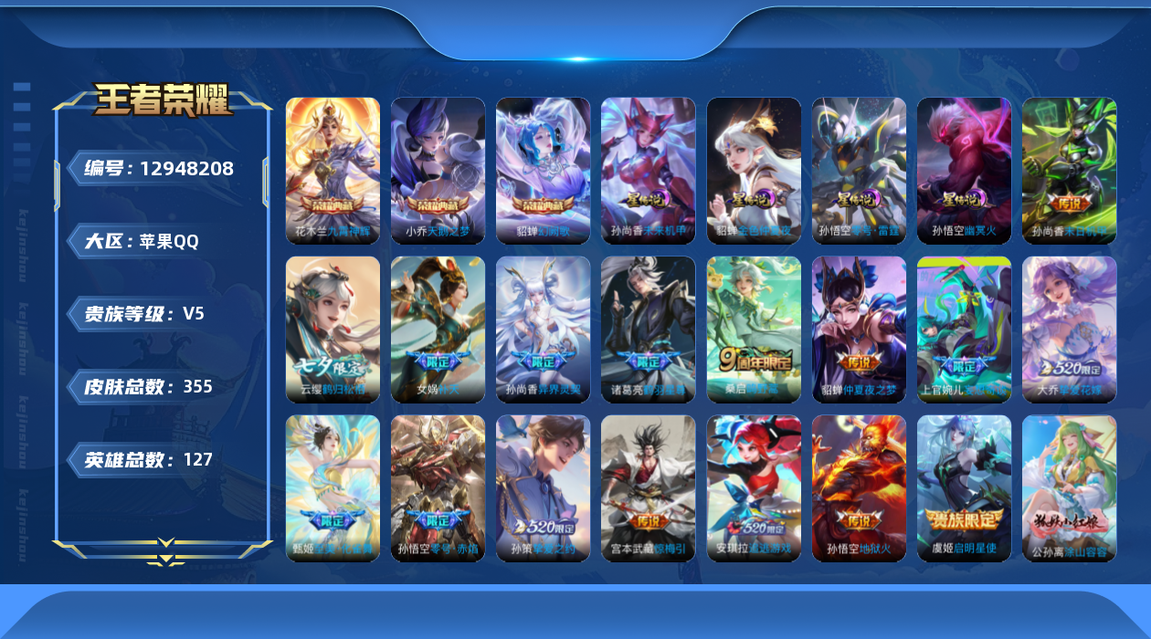 [12948208]苹果Q-V5-尊贵铂金I段位-127英雄-355皮肤-3典藏-4星元-16传说-115史诗