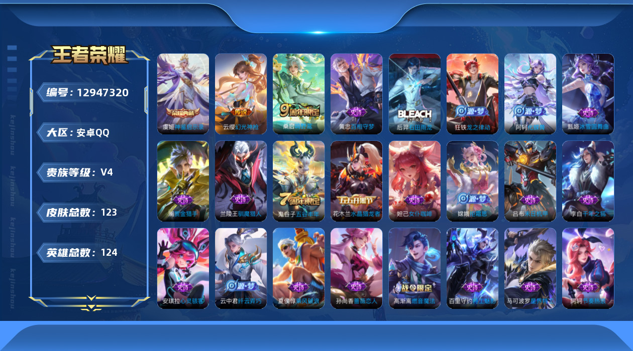 [12947320]【暑期末清货/特价急出/永久包赔】:安卓Q-V4-至尊星耀I段位-124英雄-123皮肤-1典藏-2传说-34史诗