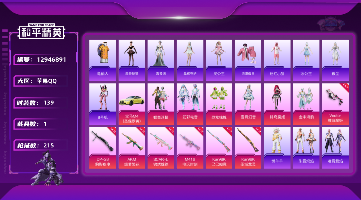 - PX_2065993- 安卓手Q-3王牌印记-9粉装-8特效枪-1载具-55771热力值-112套装-176枪皮-1卓越印记-0传奇印记 【9粉装】,梦幻火箭,初号机款机体服,智耀战神,光极星,玩偶服-猪猪侠,暖暖奶龙,紫电风暴,琉璃脉冲,吟月归客 【8特效枪】AKM-炫紫旋律-5级 SCAR-L-梦幻火箭-4级 M416-风花雪月-7级 GROZA-镜光银凌-4级 M762-青锋波束-5级 Ka