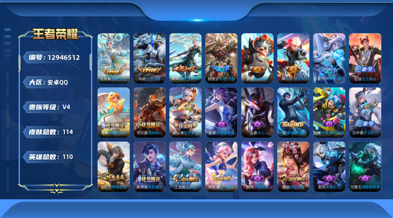 [12946512]【暑期末清货/特价急出/永久包赔】:安卓Q-V4-至尊星耀IV段位-110英雄-114皮肤-6传说-31史诗