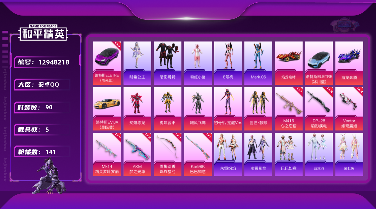 [12948218]【特价急出/详情看图】:安卓 手Q-6粉装-7特效枪-5载具-5.1w热力值-6印记-90套装-141枪皮【优质套装】:粉装-梦幻火箭,粉装-虎啸骄阳,粉装-炙焰赤龙,粉装-飓风飞鹰,套装-创世·救赎,角色-初号机 觉醒Ver.【稀有载具等级】:路特斯ELETRE(电光紫)(三级)【稀有载具】:路特斯EVIJA(星际黄),路特斯ELETRE(电光紫),路特斯ELETRE(冰川蓝),焰龙咆哮,海龙奔腾【特效枪等级】:AKM-梦之光华(三级),M416-心之恋语(七级),Vector-绯穹魔姬(四级),Kar98K-巳巳如意(一级),Mk14-精灵梦叶罗丽(四级),DP-28-豹影疾电(五级),爆炸猎弓-雪梅暗香(三级)【优质飞行器】:梦之光华飞行器,星夜魔法师飞行翼,初号机 觉醒Ver.飞行器