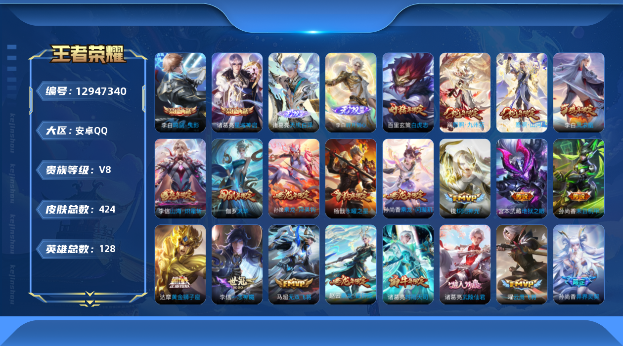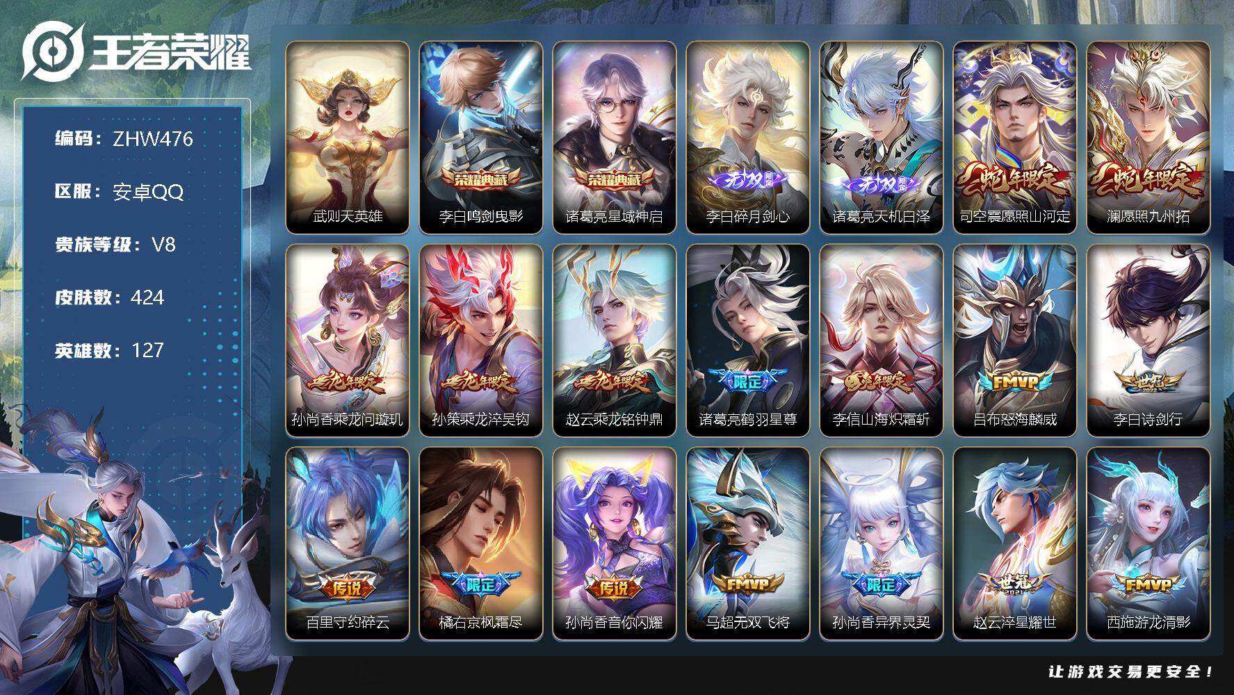 [12947340]安卓Q-V8-至尊星耀IV段位-127英雄-424皮肤-2典藏-0珍品无双-2无双-0珍品传说-40传说-132史诗