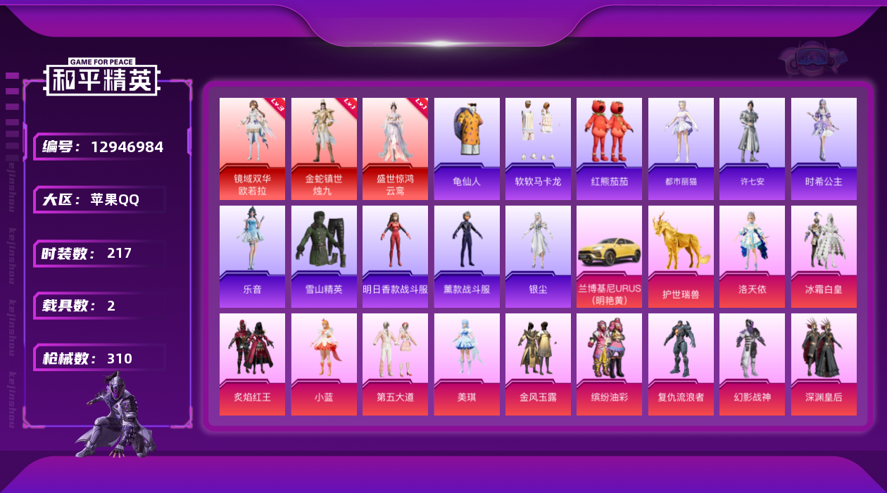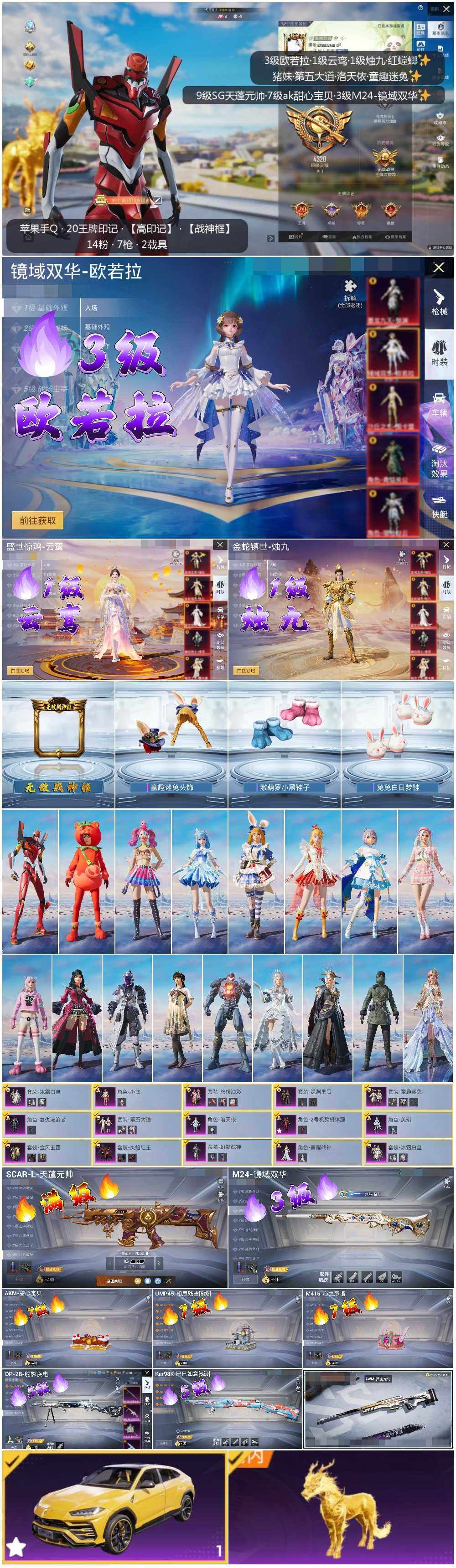 - PX_2088460- 可二次 安卓手Q-7王牌印记-11粉装-4特效枪-0载具-43736热力值-100套装-124枪皮-0卓越印记-0传奇印记, 【11粉装】,宝贝奶油派,童趣迷兔,洛天依,俏雪含霜,冰霜白皇,炙焰红王,彩虹鹿灵,山涧鹿灵,骨龙祭渊,蜜桃特工,蝶舞蔷薇, 【4特效枪】,AKM-星际浪客-4级,M416-心之恋语-6级,SLR-暗夜玫瑰-5级,DP-28-圣堂之誓-3级, 【2稀