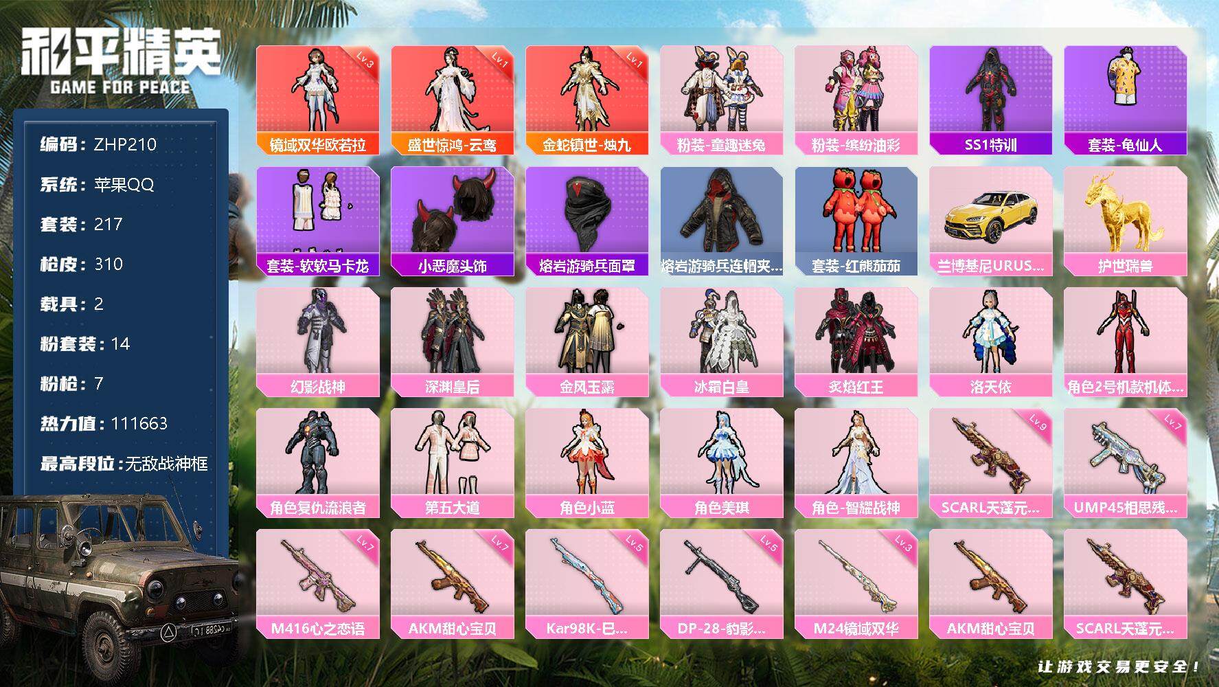[12946984]素材身法号/无敌战神框1/绝世印记4/SCAR-L-天蓬元帅(九级)【特价急出/详情看图】:苹果 手Q-无敌战神框-3神装-14粉装-7特效枪-2载具-9粉色飞行器-11.1w热力值-20王牌印记-217套装-310枪皮【红色神装等级】:金蛇镇世-烛九(一级),盛世惊鸿-云鸾(一级),镜域双华-欧若拉(三级)【热门品类】:粉装-童趣迷兔,粉装-缤纷油彩,套装-SS1特训,套装-龟仙人,套装-软软马卡龙,小恶魔头饰,熔岩游骑兵面罩,熔岩游骑兵连帽夹克,套装-红熊茄茄【粉色载具】:兰博基尼URUS(明艳黄),护世瑞兽【粉色套装】:粉装-幻影战神,粉装-深渊皇后,粉装-金风玉露,粉装-缤纷油彩,粉装-冰霜白皇,粉装-童趣迷兔,粉装-炙焰红王,角色-洛天依,角色-2号机款机体服,角色-复仇流浪者,粉装-第五大道,角色-小蓝,角色-美琪,角色-智耀战神【粉色枪皮等级】:AKM-甜心宝贝(七级),SCAR-L-天蓬元帅(九级),M416-心之恋语(七级),UMP45-相思残雪(七级),Kar98K-巳巳如意(五级),M24-镜域双华(三级),DP-28-豹影疾电(五级)【粉色飞行器】:酣梦熊熊飞行器,相思残雪飞行器,齐天大圣飞行器,繁龙极客飞行器,镜域双华-灵镜之阶,龙翔九天飞行器,脆鲨七海飞行器,万象金身飞行器