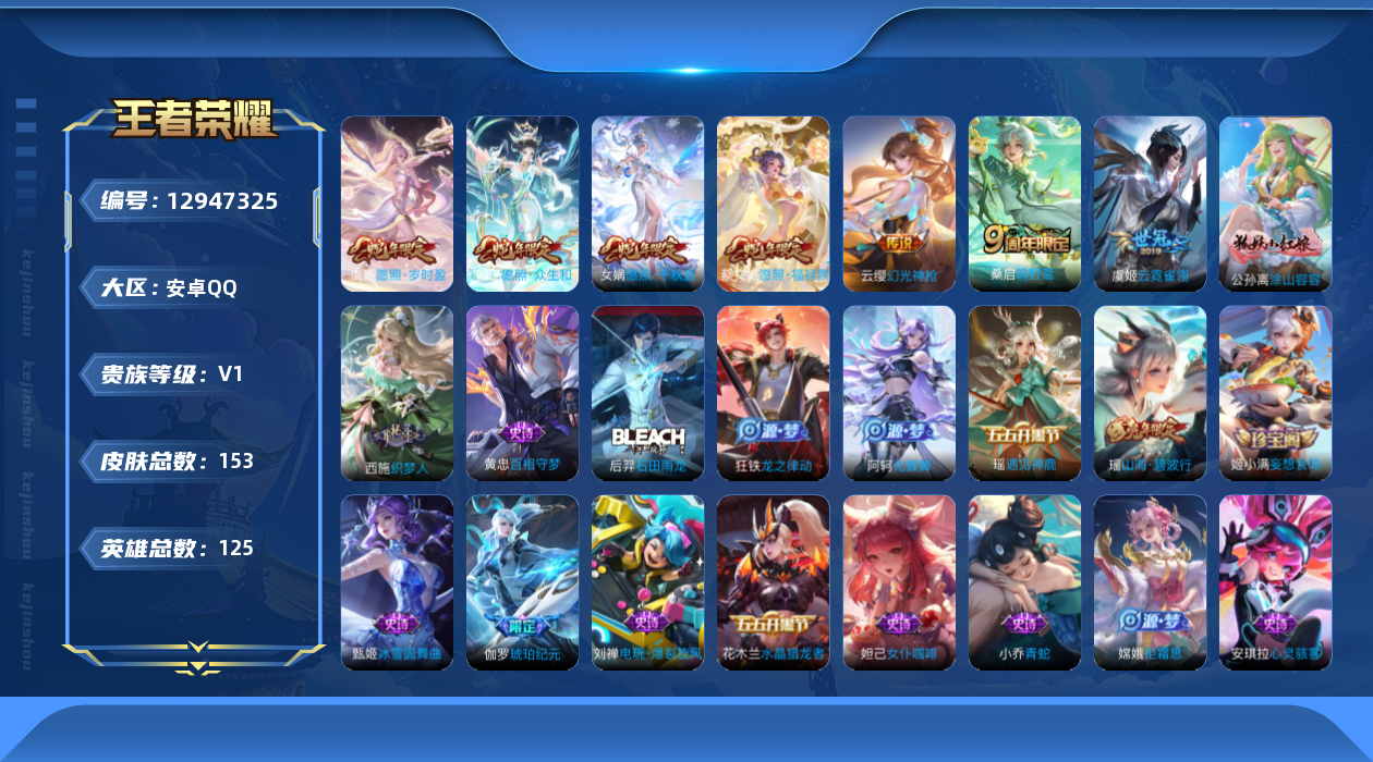 - [11548124]V9 2典藏 1无双 3珍品传说 37传说 125英雄 397皮肤 可修改实名 女号 优质装备:鸣剑·曳影,星域神启(倪克斯贼亮),花合斗,酷洛米之心,大耳狗之梦,黄金狮子座,冠军飞将,云鹰飞将(小将军),绛天战甲(鸡嘴战神),久胜战神,炽阳神光,一念神魔,末日机甲-孙尚香(绿蚂蚱),仲夏夜之梦(大飞蛾),飞鸢探春,时之恋人-刘备(电焊工),游龙清影(小青龙),末日机甲-孙策,无双飞将,碎云,山海·炽霜斩(李信年限),记忆之芯(机甲兔),遇见神鼓,鲁班七号-时之奇旅,大乔-时之奇旅,霜月吟,澜逐花归海,玄雷天君,涂山容容 珍品传说:兔狲·蓬尾 传说皮:云诺千山,铠冥王哈迪斯,续相思,幻光神枪 珍宝阁皮:妄想食味,万物之道,蔷薇恋人 限定皮:愿照·九州拓(澜年限),愿照·岁时盈(虞姬年限),愿照·众生和(妲己年限),逐霄战戟,映山客,陌上桑,鸣野蒿,至尊宝,异界灵契(白毛香),时雨天司(水龙头),至美·乘鲤谣,至美·化雀舞,遇见飞天,怒海麟威,五谷丰年,岱宗(典韦年限),虎魄,朱雀志(守约年限),神器·万象笔 史诗皮:鸭鸭历险记-刘禅,飞车小橘子,狼魂孤将,化蝶舞,灵蛊蚀心,星界战将,龙之律动,雪豹·霜爪,藏狐·褐绒,布丁狗之誓,石田雨龙,百相守梦-周瑜,茶境仙,破空之剑,战舞者,东方月初,蒙犽顽岩魄,芈月浮光幕影,上官婉儿群星魔术团,蔬乡物语(鲁班七号),超元猎域,百相守梦-百里守约,星界特工,百相守梦-黄忠,织梦人,遇见神鹿,紫霞仙子,电玩小子(小书包),黄金分割率,特工魅影,千年之狐,江河有灵,匿光侦查者,雪夜绮愿(周瑜),真我赫兹(百里守约),魅语,百解令(蒙犽),高渐离燃音魔法,冰冠公主,青蛇,晚萤,电玩·爆裂旋风,百相守梦(刘备),暗夜猫娘,龙骑士(小龙虾),末日机甲-吕布,猫狗日记-孙策,猫狗日记-大乔,乱世虎臣,节奏热浪,女仆咖啡,摇滚巨星,水果甜心,绅士熊喵,天才门将,星夜王子,心灵骇客,功夫厨神,德古拉伯爵,暗隐猎兽者,幽灵船长,鬼剑武藏,暗渊魔法,心灵战警,天秀·启明,舞动绿茵,地狱岩魂,诗语江南,纤云弄巧,拒霜思,缤纷独角兽,乘风破浪,逐浪之夏,龙鼓争鸣,水晶猎龙者,曙光守护者,箭羽风息,唤灵魅影,金属风暴,圣诞狂欢,鹰眼统帅,暗夜贵公子,魅力维加斯,赏金猎手,无心,未来纪元-赵云