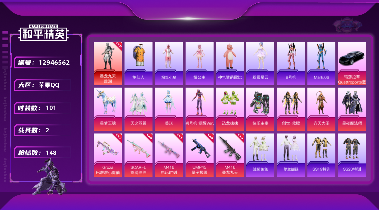 [12946562]【暑期末清货/特价急出/永久包赔】:苹果 手Q-1红装-9粉装-5特效枪-2载具-5w热力值-7印记-101套装-148枪皮【角色神装等级】:墨龙九天-敖渊(二级)【稀有载具】:玛莎拉蒂Quattroporte(夜幕蓝),星梦玉骢【特效枪等级】:SCAR-L-锦绣绵绵(五级),M416-电玩时刻(五级),M416-墨龙九天(三级),GROZA-巴啦啦小魔仙(七级),UMP45-量子极限(五级)【优质套装】:粉装-快乐主宰,粉装-梦幻火箭,粉装-齐天大圣,粉装-天之羽翼,粉装-恐龙拽拽,粉装-星夜魔法师,角色-美琪,套装-创世·救赎,角色-初号机 觉醒Ver.【优质飞行器】:龙翔九天飞行器,冠军兔兔飞行器,曦光华影飞行器