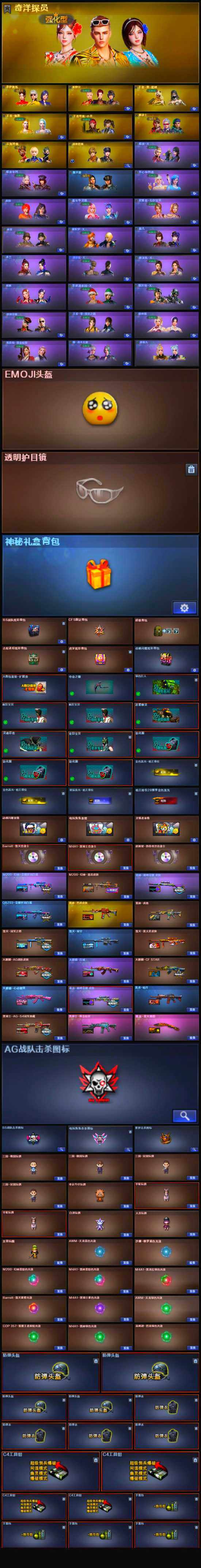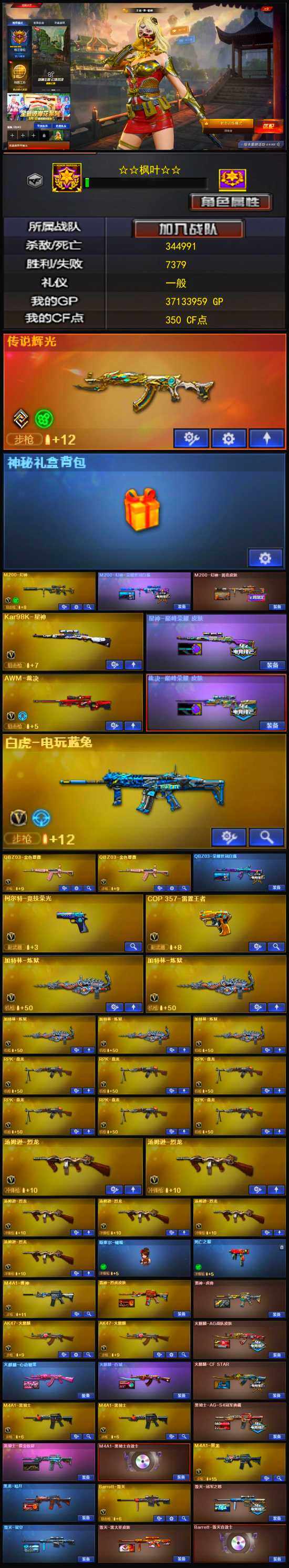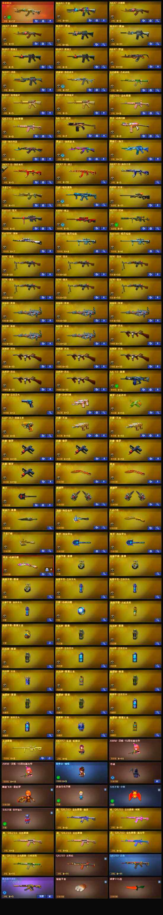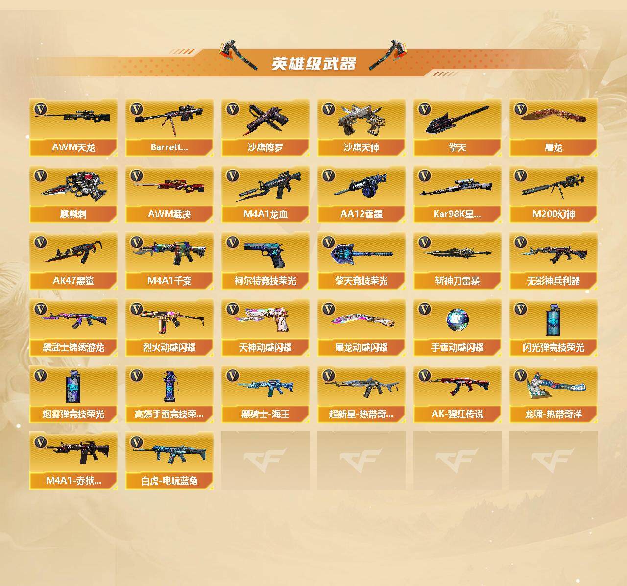 【英雄级武器】:柯尔特-竞技荣光,擎天-竞技荣光*2,高爆手雷-竞技荣光*3,烟雾弹-竞技荣光*2,闪光弹-竞技荣光*2,斩神刀-雷暴,烈火-动感闪耀,天神-动感闪耀,屠龙-动感闪耀,手雷-动感闪耀,QBZ03-金色蔷薇*2,金色蔷薇-古蛇迷踪,白虎-电玩蓝兔,无影-神兵利器,M4A1-雷神,M4A1-黑龙,M4A1-玫瑰精灵*2,M4A1-黑骑士*2,RPK-盘龙*6,加特林-炼狱*5,汤姆逊-烈龙*6,AK47-火麒麟*2,AWM-天龙,Barrett-毁灭,AWM-裁决,M4A1-龙血,AA-12-雷霆,Kar98K-星神,M200-幻神,AK47-黑鲨,M4A1-千变,黑武士-锦绣游龙,黑骑士-海王,超新星-热带奇洋,AK-47-猩红传说,AK47-B-常胜将军,M4A1-赤狱骑士,修罗-古蛇迷踪,沙鹰-天神*2,沙鹰-修罗*4,麒麟刺*2,擎天,屠龙*2,龙啸-热带奇洋