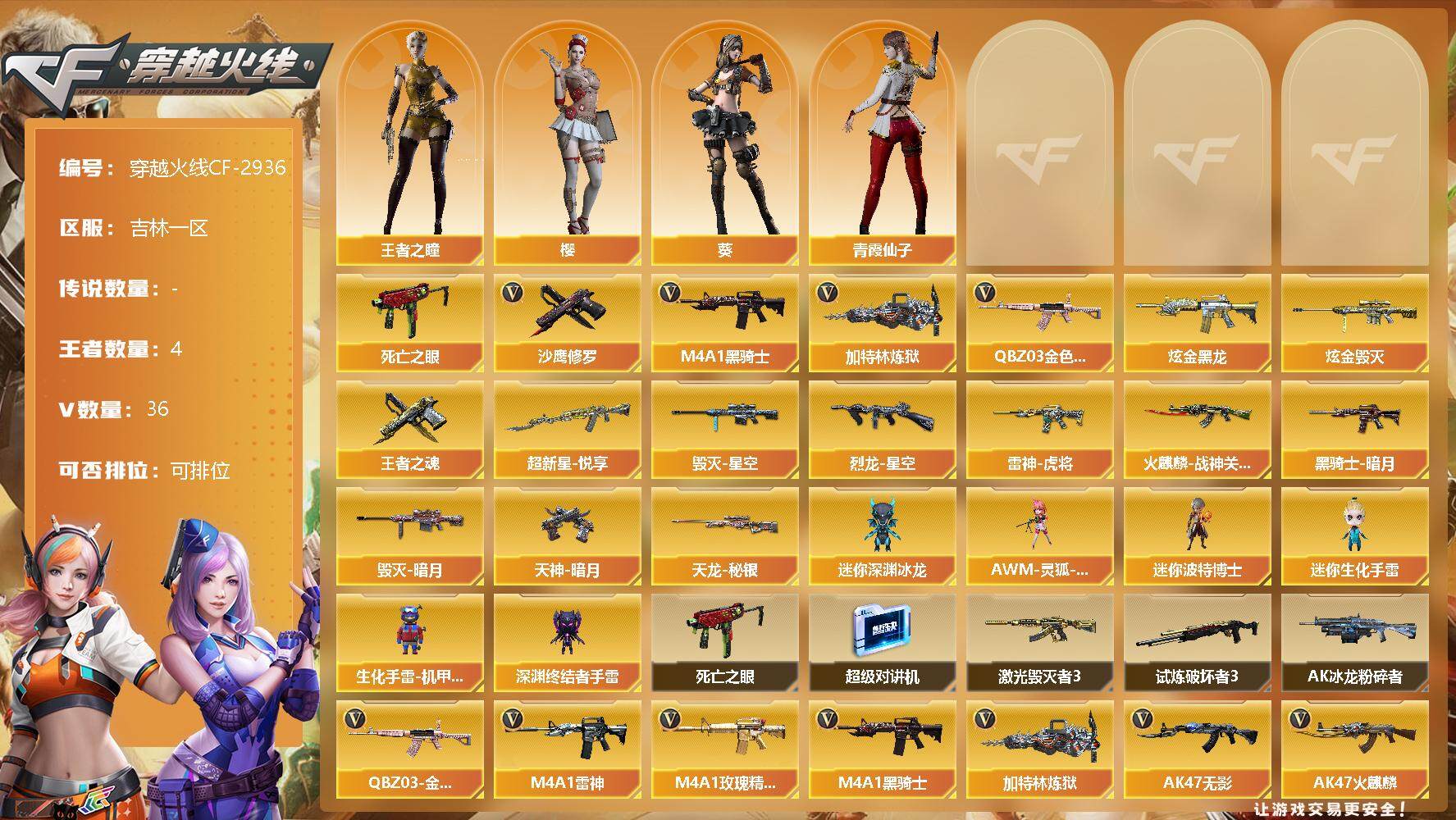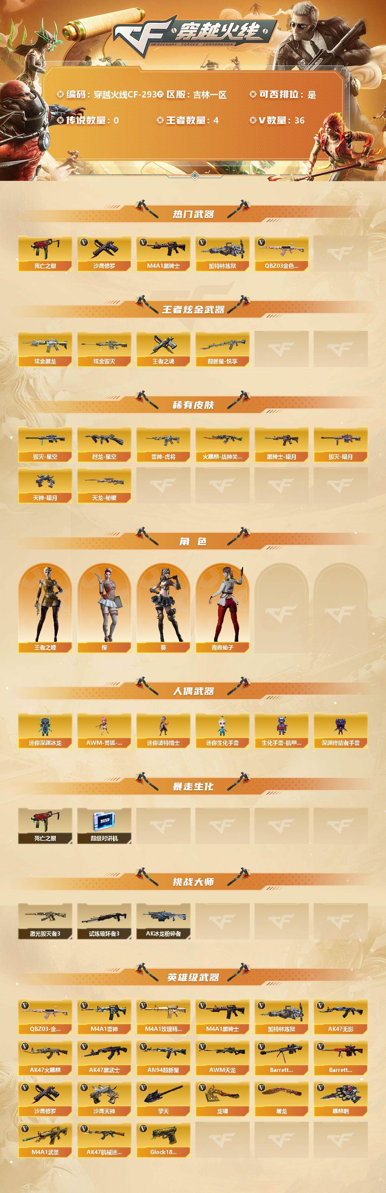 [12946716]吉林一区-36V-4王者-2炫金 【热门武器】:QBZ03-金色蔷薇,死亡之眼,M4A1-黑骑士,加特林-炼狱*2,沙鹰-修罗*3 【王者炫金武器】:炫金黑龙,炫金毁灭,超新星-悦享,王者之魂 【稀有皮肤】:雷神-虎将,火麒麟-战神关羽,黑骑士-暗月,毁灭-暗月*2,毁灭-星空,天龙-秘银*2,烈龙-星空,天神-暗月*3 【角色】:王者之瞳,葵,樱,青霞仙子 【人偶武器】:AWM-灵狐-15周年嘉年华,迷你深渊冰龙,迷你波特博士*4,迷你生化手雷,生化手雷-机甲核心,深渊终结者手雷 【暴走生化】:死亡之眼,超级对讲机 【挑战大师】:试炼破坏者III,激光毁灭者III,AK47-冰龙粉碎者 【英雄级武器】:M4A1-武圣,Glock18-武圣,QBZ03-金色蔷薇,M4A1-雷神*2,M4A1-玫瑰精灵,M4A1-黑骑士,加特林-炼狱*2,AK47-无影,AK47-火麒麟*2,AK47-黑武士*5,AN94-超新星,AWM-天龙*2,Barrett-毁灭*2,Barrett-极光,AK47-机械迷城,沙鹰-天神,沙鹰-修罗*3,麒麟刺,擎天,龙啸*2,屠龙*2 【特殊枪械】:1黑骑士,2炼狱