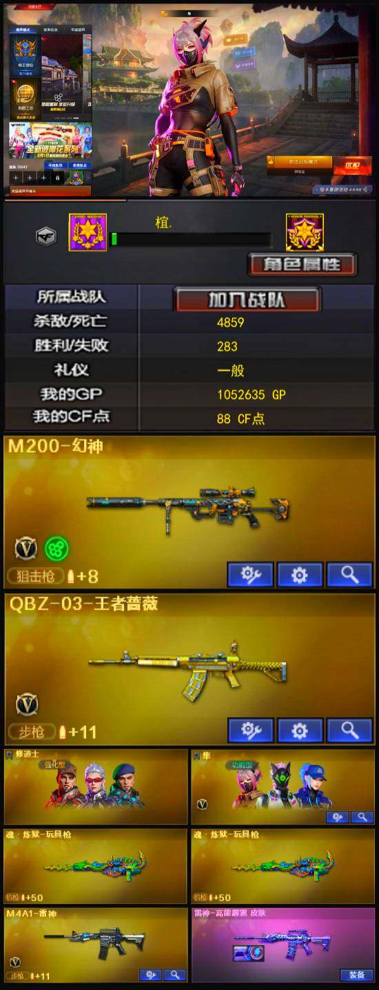 - [12710654]安徽一区-31V-5王者-0炫金 【热门武器】:QBZ03-金色蔷薇,M4A1-青龙,M200-幻神,白虎-电玩蓝兔,柯尔特-冠军之特*2,M4A1-黑骑士,汤姆逊-烈龙,加特林-炼狱,沙鹰-修罗*2,Knife-冠军之刃 【王者炫金武器】:王者之城 【音效卡】:M200-幻神音效卡,M4A1-黑骑士音效卡,Barrett-毁灭音效卡 【稀有皮肤】:幻神-巅峰荣耀,QBZ03-冠军之薇,雷神-荣耀之魄,火麒麟-轻羽皮肤,火麒麟-平天大圣,火麒麟-盘古,火麒麟-心动糖果,黑骑士-冠军之势,黑骑士-地狱火,毁灭-暗月,毁灭-荣耀之怒,修罗-星空 【角色】:关小雨,铁骑荣耀,青霞仙子 【人偶武器】:AWM-灵狐-15周年嘉年华,M4A1-雷神-精英刀锋,黄金迷你深渊冰龙,迷你超能女侍,生化手雷-机甲核心 【暴走生化】:超级对讲机 【英雄级武器】:尼泊尔-电竞装甲,马来剑-夜魔,QBZ03-金色蔷薇,M4A1-青龙,白虎-电玩蓝兔,M4A1-雷神,M4A1-黑骑士,加特林-炼狱,汤姆逊-烈龙,AK47-火麒麟,AK12-天启,Barrett-毁灭,AK47-机械迷城,M200-幻神,黑武士-锦绣游龙,AK-47-猩红传说*2,柯尔特-冠军之特*2,沙鹰-修罗*2,麒麟刺,屠龙 【特殊枪械】:1黑骑士,1烈龙,1炼狱