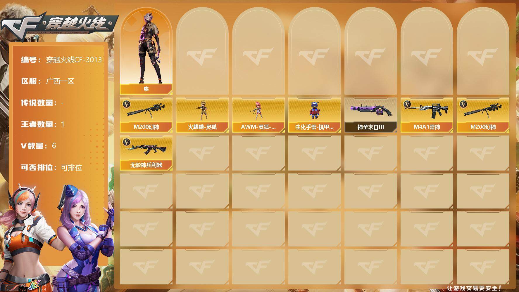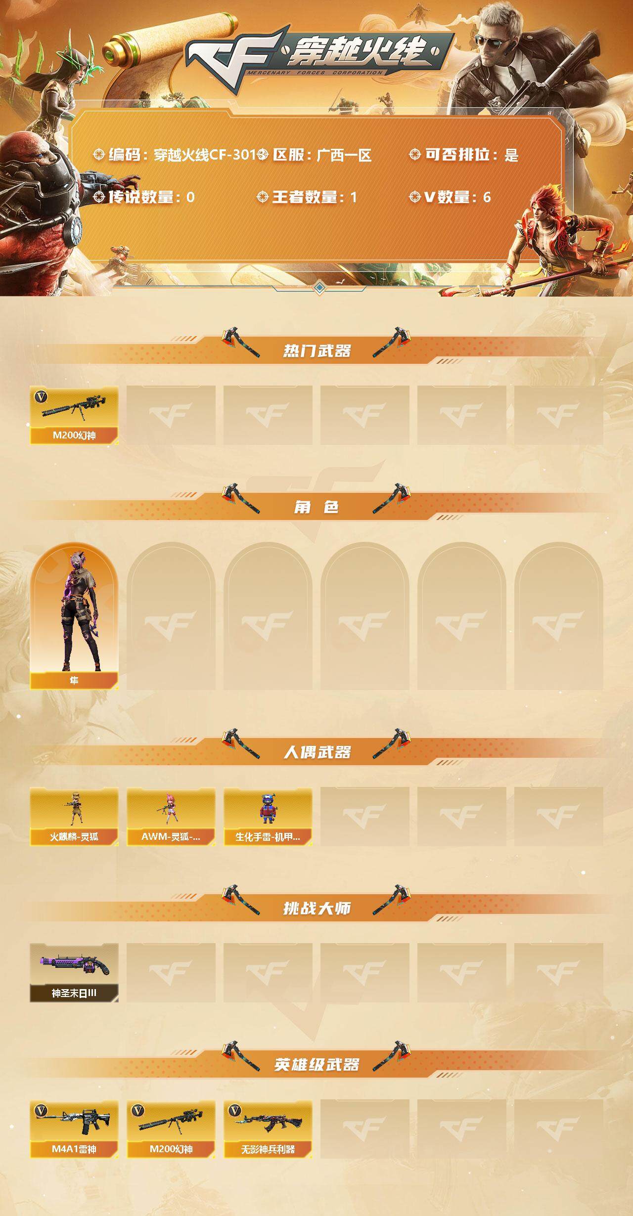 [12947389]广西一区-6V-1王者-0炫金 【热门武器】:M200-幻神 【角色】:隼 【人偶武器】:火麒麟-灵狐,AWM-灵狐-15周年嘉年华,生化手雷-机甲核心*2 【挑战大师】:神圣爆裂者-末日III 【英雄级武器】:无影-神兵利器,M4A1-雷神,M200-幻神 【特殊枪械】: