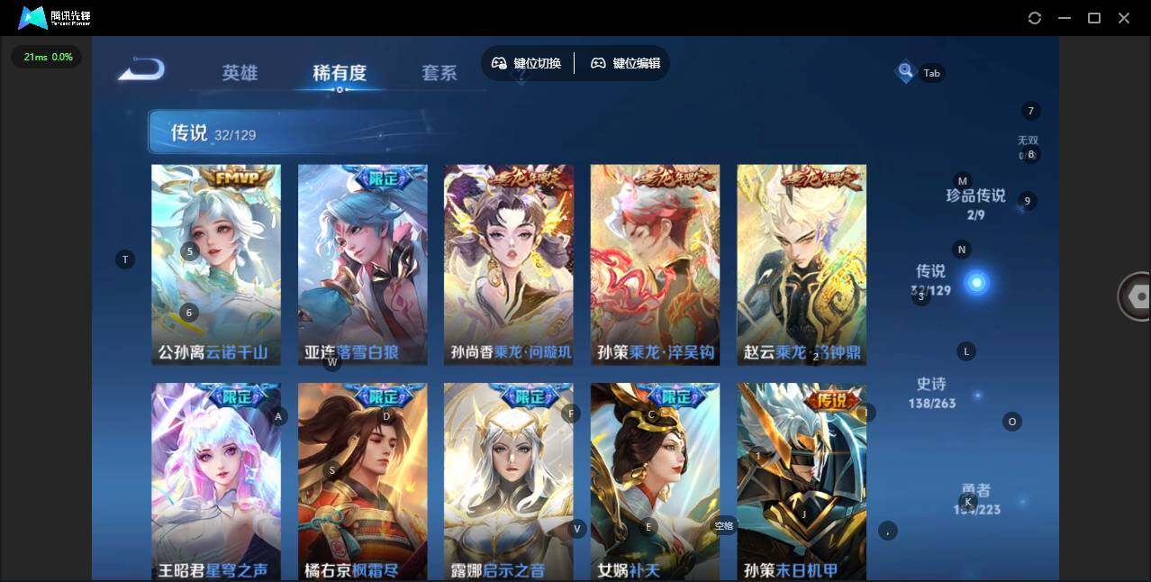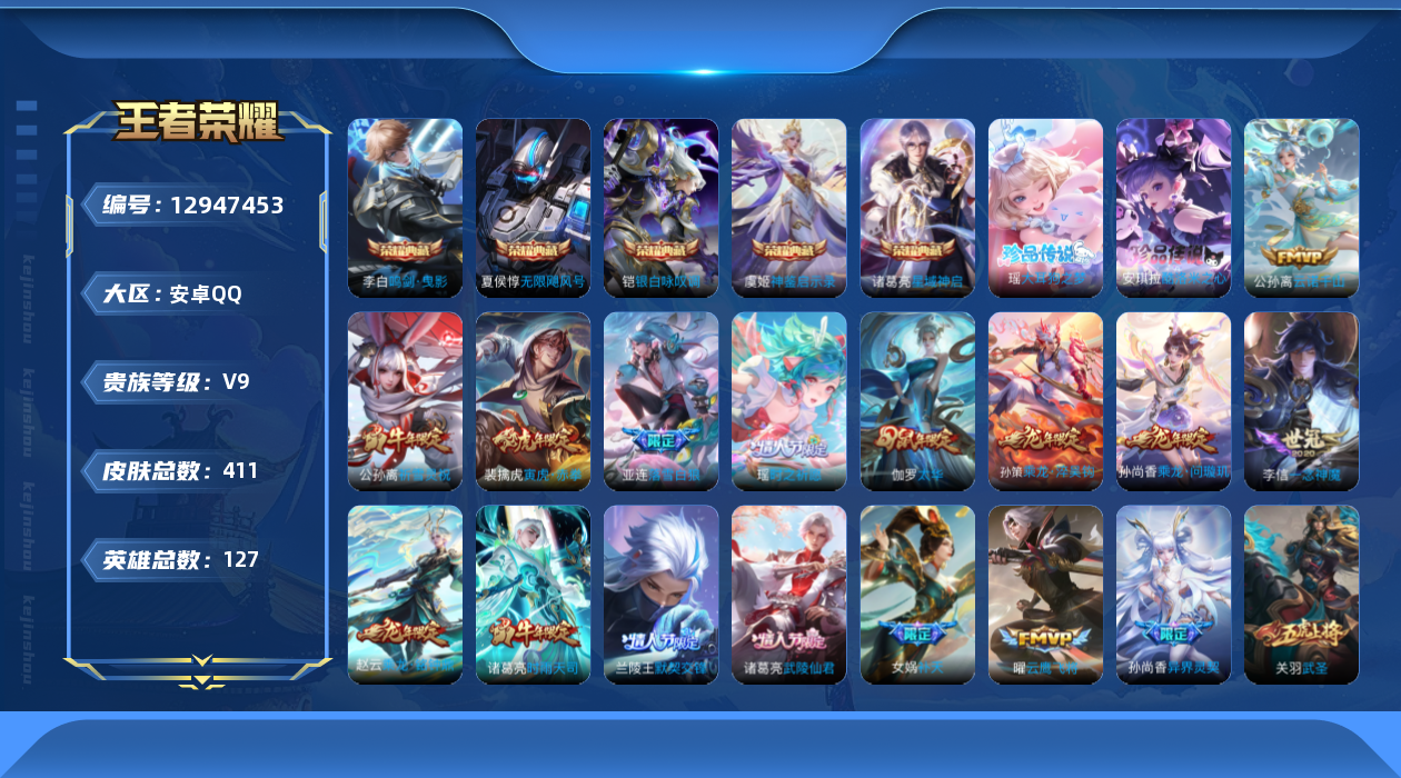 - [12143813]V8 1无双 8传说 124英雄 313皮肤 可修改实名 女号 优质装备:青丘·九尾(妲己无双),碎云,青丘·九尾,澜逐花归海 传说皮:乘龙·问璇玑(孙尚香年限),幻光神枪 珍宝阁皮:妄想食味,蔷薇恋人 限定皮:愿照·千秋盛(女娲年限),鸣野蒿,前尘镜,五谷丰年,梁祝,逐梦之星,李小龙,逐梦之影,孙行者,一生所爱,大圣娶亲,玉兔公主 史诗皮:鸭鸭历险记-刘禅,化蝶舞,龙之律动,雪豹·霜爪,茶境仙,芈月浮光幕影,上官婉儿群星魔术团,蔬乡物语(鲁班七号),百相守梦-百里守约,织梦人,遇见神鹿,紫霞仙子,黄金分割率,特工魅影,千年之狐,江河有灵,真我赫兹(百里守约),百解令(蒙犽),高渐离燃音魔法,匿光破解者,冰冠公主,青蛇,晚萤,电玩·爆裂旋风,暗夜猫娘,银翎春语,猫狗日记-孙策,猫狗日记-大乔,时之恋人-孙尚香,节奏热浪,女仆咖啡,摇滚巨星,水果甜心,星夜王子,心灵骇客,功夫厨神,暗隐猎兽者,幽灵船长,鬼剑武藏,心灵战警,舞动绿茵,诗语江南,纤云弄巧,繁星吟游(呼啦呼啦),拒霜思,缤纷独角兽,乘风破浪,逐浪之夏,水晶猎龙者,曙光守护者,热力回旋,箭羽风息,唤灵魅影,金属风暴,原初追逐者,圣诞狂欢,圣诞恋歌,鹰眼统帅,魅力维加斯,无心,未来纪元-赵云