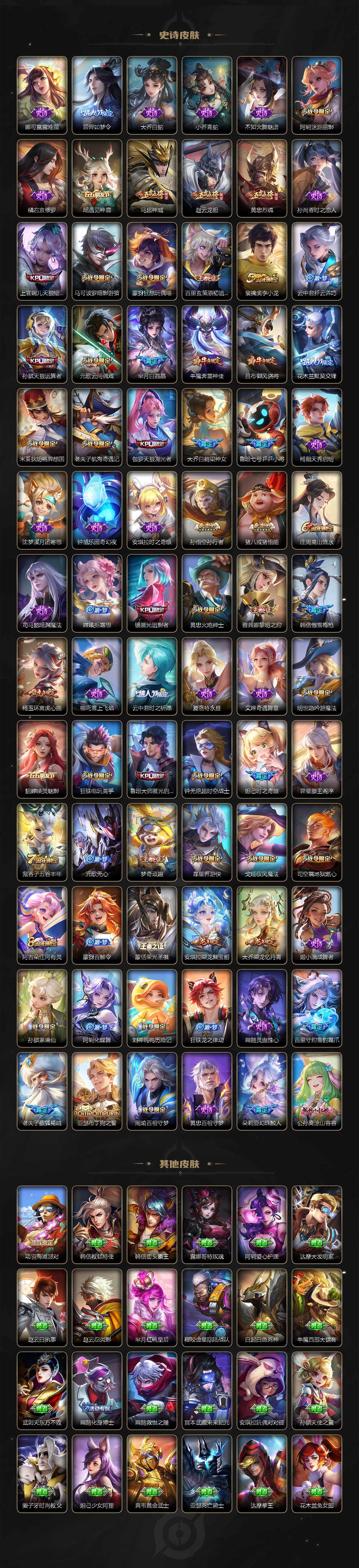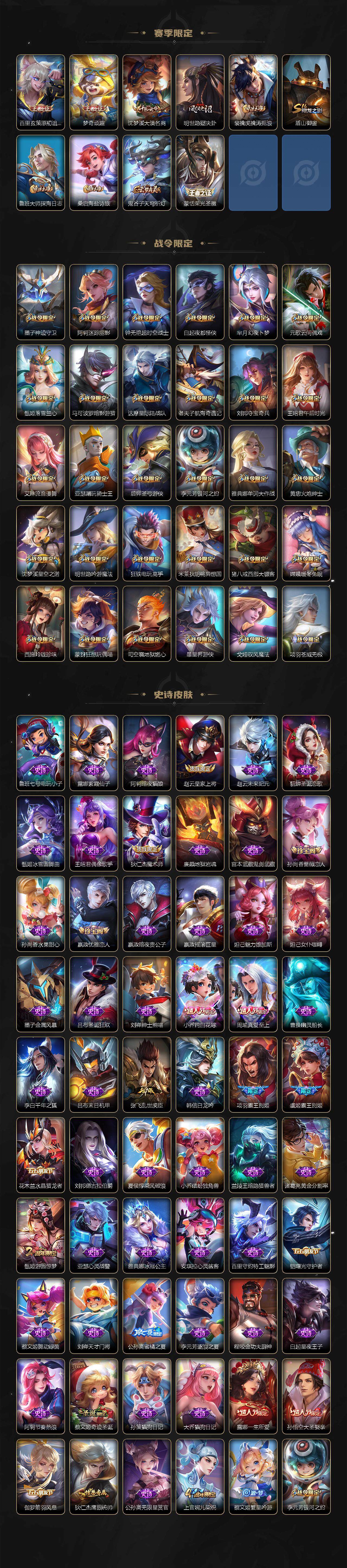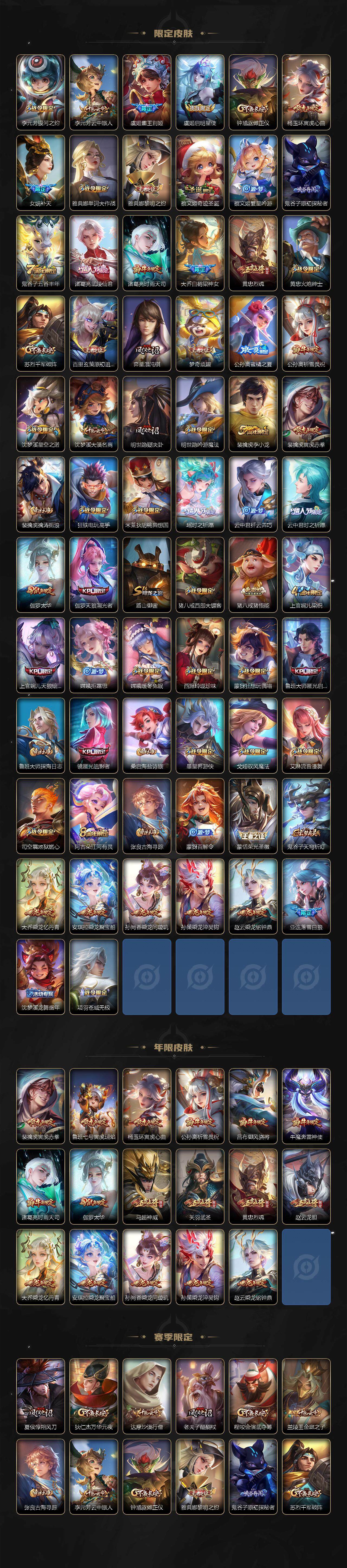 【限定皮肤】:狄仁杰阴阳师,小乔纯白花嫁,赵云皇家上将,赵云龙胆,墨子神迹守卫,妲己时之奇旅,嬴政优雅恋人,孙尚香蔷薇恋人,孙尚香异界灵契,鲁班七号乒乒小将,鲁班七号寅虎瑞焰,庄周高山流水,高渐离玩趣恶龙,阿轲迷踪丽影,钟无艳超时空战士,孙膑天狼运算者,白起夜都怪侠,芈月白晶晶,芈月幻夜卜梦,吕布御风骁将,周瑜真爱至上,元歌云间偶戏,元歌无心,夏侯惇朔风刀,甄姬游园惊梦,甄姬落雪兰心,马可波罗暗影游猎,狄仁杰魔术师,狄仁杰万华元夜,达摩星际陆战队,达摩沙漠行僧,项羽海滩派对,项羽霸王别姬,老夫子醍醐杖,老夫子航海奇遇记,关羽武圣,程咬金演武夺筹,露娜一生所爱,露娜启示之音,刘邦夺宝奇兵,韩信傲雪梅枪,王昭君午后时光,王昭君星穹之声,兰陵王默契交锋,兰陵王金庭之子,花木兰默契交锋,橘右京枫霜尽,亚瑟潮玩骑士王,孙悟空大圣娶亲,孙悟空零号赤焰,孙悟空孙行者,牛魔奔雷神使,后羿如梦令,后羿圣弓游侠,李元芳银河之约,李元芳云中旅人,虞姬霸王别姬,虞姬启明星使,钟馗驱傩正仪,杨玉环寅虎心曲,女娲补天,雅典娜单词大作战,雅典娜黎明之约,蔡文姬奇迹圣诞,蔡文姬繁星吟游,鬼谷子原初探秘者,鬼谷子五谷丰年,诸葛亮武陵仙君,诸葛亮时雨天司,大乔白鹤梁神女,黄忠烈魂,黄忠火炮绅士,苏烈千军破阵,百里玄策原初追逐者,弈星混沌棋,梦奇顽趣,公孙离蜜橘之夏,公孙离祈雪灵