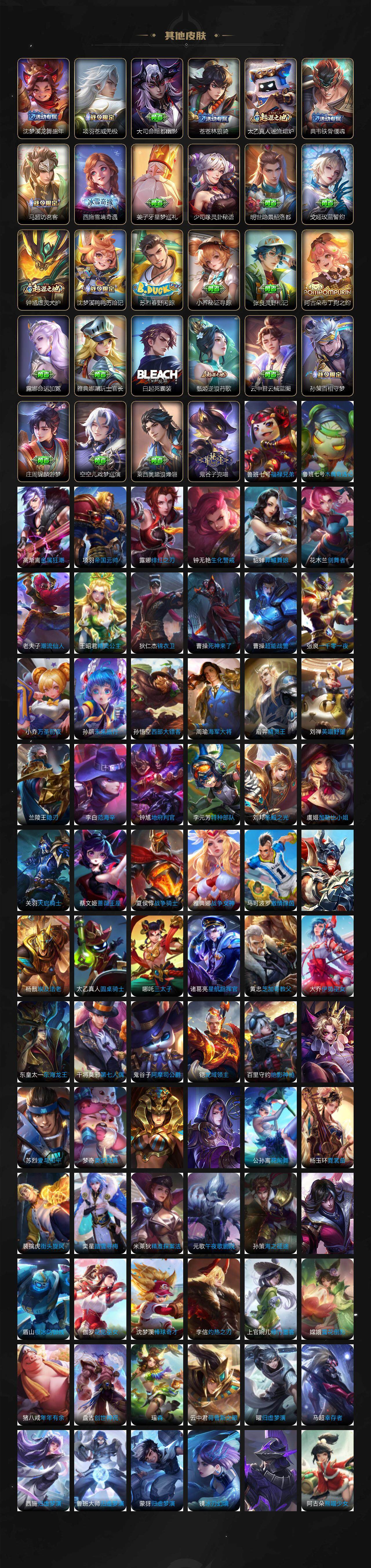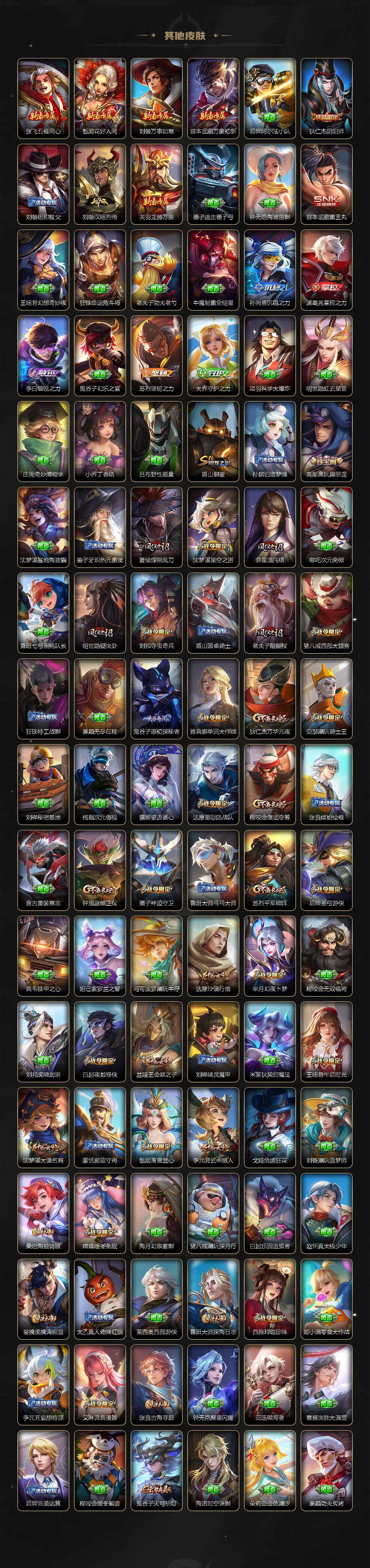 小乔青蛇,大乔白蛇,瑶遇见神鹿,娜可露露晚萤,伽罗箭羽风息,李元芳逐浪之夏,不知火舞魅语,公孙离无限星赏官,大乔猫狗日记,孙策猫狗日记,阿轲节奏热浪,露娜紫霞仙子,诸葛亮黄金分割率,王昭君偶像歌手,韩信白龙吟,孙尚香时之恋人,阿轲暗夜猫娘,雅典娜冰冠公主,吕布末日机甲,鲁班七号电玩小子,橘右京修罗,嬴政摇滚巨星,刘禅绅士熊喵,刘禅天才门将,白起星夜王子,安琪拉心灵骇客,安琪拉时之奇旅,程咬金功夫厨神,刘邦德古拉伯爵,兰陵王暗隐猎兽者,曹操幽灵船长,宫本武藏鬼剑武藏,司马懿暗渊魔法,亚瑟心灵战警,钟馗乐园奇幻夜,杨戬天秀·启明,蔡文姬舞动绿茵,廉颇地狱岩魂,小乔缤纷独角兽,夏侯惇乘风破浪,花木兰水晶猎龙者,铠曙光守护者,墨子金属风暴,百里玄策原初追逐者,吕布圣诞狂欢,貂蝉圣诞恋歌,百里守约特工魅影,嬴政暗夜贵公子,嫦娥拒霜思,雅典娜黎明之约,李白千年之狐,哪吒雪上飞焰,夏洛特永昼,艾琳奇遇舞章,貂蝉唤灵魅影,弈星滕王阁序,蒙犽百解令,大乔乘龙·忆丹青,安琪拉乘龙·聚宝船