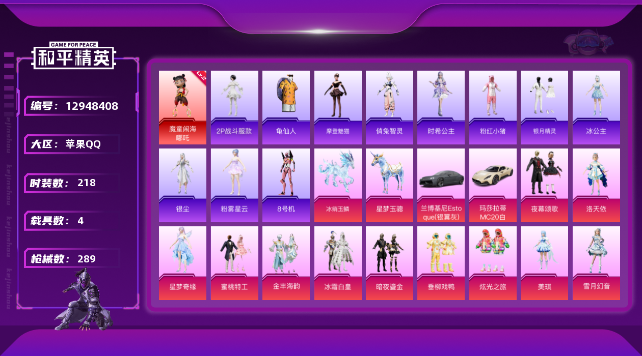 [12948408]无敌战神框2/绝世印记5/扭蛋碎片1004【特价急出/详情看图】:苹果 手Q-1红装-13粉装-10特效枪-4载具-10.9w热力值-20印记-218套装-289枪皮【红色神装等级】:魔童闹海-哪吒(二级)【热门品类】:套装-深海小丑鱼,套装-胖达圆圆,角色-2P战斗服款【粉色载具】:兰博基尼Estoque(银翼灰),玛莎拉蒂MC20(星石白),星梦玉骢,冰绡玉鳞【粉色套装】:粉装-冰霜白皇,粉装-蜜桃特工,粉装-暗夜玫瑰,角色-洛天依,粉装-垂柳戏鸭,粉装-暗夜鎏金,粉装-炫光之旅,粉装-夜幕颂歌,角色-美琪,角色-电磁星,角色-星梦奇缘,粉装-金丰海韵,粉装-雪月幻音【粉色枪皮等级】:AKM-绿萝繁花(五级),SCAR-L-锦绣绵绵(五级),M416-心之恋语(七级),M416-电玩时刻(五级),P90-魔童闹海 敖丙(二级),Kar98K-巳巳如意(五级),SLR-暗夜玫瑰(七级),DP-28-豹影疾电(五级),MG3-洛神天依(七级),PKM-江南烟雨(七级)【粉色飞行器】:龙翔九天飞行器,曦光华影飞行器,凤舞九天飞行器,飞天猪飞行器,灵珠游龙飞行器