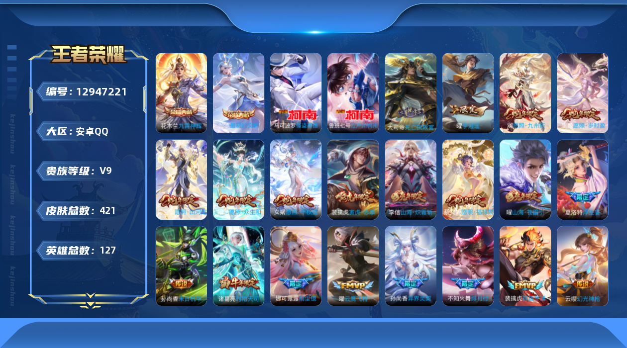 [12947221]【特价急出/详情看图】:安卓Q-V9-至尊星耀II段位-126英雄-421皮肤-2典-2珍品传说-37传说-136史诗