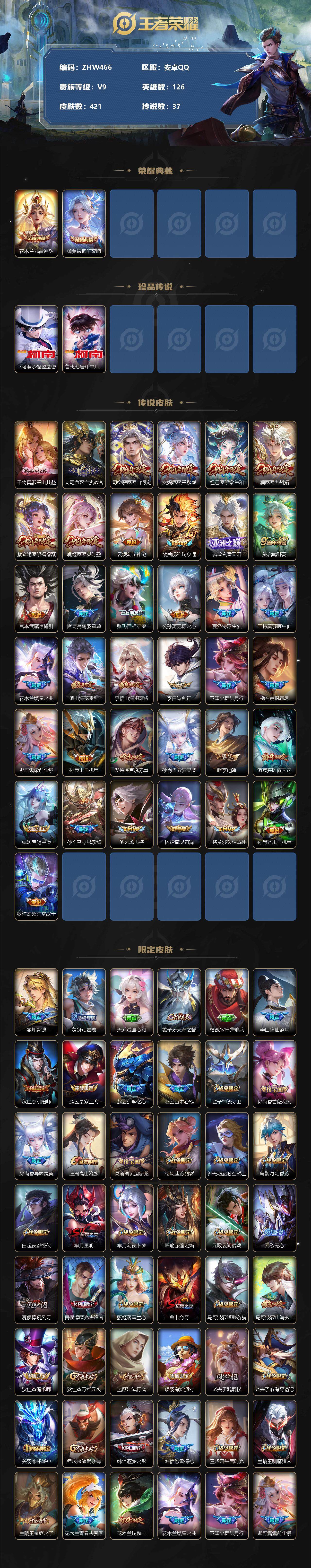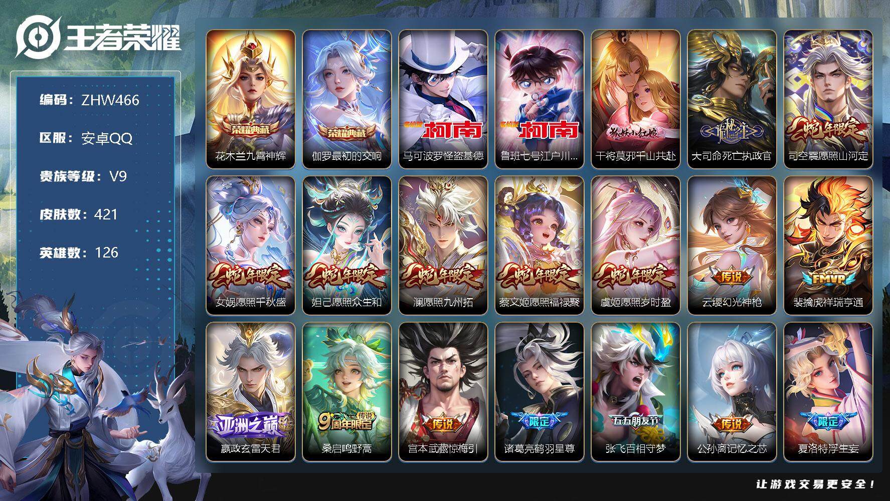 [12947221]【特价急出/详情看图】:安卓Q-V9-至尊星耀II段位-126英雄-421皮肤-2典-2珍品传说-37传说-136史诗 【英雄全皮】:刘禅全皮,娜可露露全皮,橘右京全皮,钟馗全皮,苍全皮,鬼谷子全皮,盾山全皮,猪八戒全皮,大司命全皮,鲁班大师全皮,夏洛特全皮,司空震全皮,戈娅全皮,空空儿全皮,影全皮,少司缘全皮 【荣耀典藏】:花木兰九霄神辉,伽罗最初的交响 【珍品传说】:马可波罗怪盗基德,鲁班七号江户川柯南 【传说皮肤】:干将莫邪千山共赴,大司命死亡执政官,司空震愿照山河定,女娲愿照千秋盛,妲己愿照众生和,澜愿照九州拓,蔡文姬愿照福禄聚,虞姬愿照岁时盈,云缨幻光神枪,裴擒虎祥瑞亨通,嬴政玄雷天君,桑启鸣野蒿,宫本武藏惊梅引,诸葛亮鹤羽星尊,张飞百相守梦,公孙离记忆之芯,夏洛特浮生妄,干将莫邪画中仙,花木兰燃星之曲,曜山海苍雷引,李信山海炽霜斩,李白诗剑行,不知火舞绯月行,橘右京枫霜尽,娜可露露前尘镜,孙策末日机甲,裴擒虎寅虎赤拳,孙尚香异界灵契,曜李逍遥 ,诸葛亮时雨天司,虞姬启明星使,孙悟空零号赤焰,曜云鹰飞将,貂蝉猫影幻舞,干将莫邪久胜战神,孙尚香末日机甲,狄仁杰超时空战士 【限定皮肤】:暃埋骨钱,蒙犽顽岩魄,大乔绒语心约,姜子牙天穹之誓,杨戬破阵退雄兵,李白谪仙醉月,狄仁杰阴阳师,赵云皇家上将,赵云引擎之心,赵云百木心枪,墨子神迹守卫,孙尚香蔷薇恋人,孙尚香异界灵契,庄周高山流水,高渐离玩趣恶龙,阿轲迷踪丽影,钟无艳超时空战士,扁鹊奇幻香踪,白起夜都怪侠,芈月重明,芈月幻夜卜梦,周瑜赤莲之焰,元歌云间偶戏,元歌无心,夏侯惇朔风刀,夏侯惇匿光决锋者,甄姬落雪兰心,典韦穷奇,马可波罗暗影游猎,马可波罗山海玄木吟,狄仁杰魔术师,狄仁杰万华元夜,达摩沙漠行僧,项羽海滩派对,老夫子醍醐杖,老夫子航海奇遇记,关羽冰锋战神,程咬金演武夺筹,韩信逐梦之影,韩信傲雪梅枪,王昭君午后时光,兰陵王驯魔猎人,兰陵王金庭之子,花木兰青春决赛季,花木兰瑞麟志,花木兰燃星之曲,不知火舞绯月行,娜可露露前尘镜,橘右京枫霜尽,亚瑟潮玩骑士王,孙悟空至尊宝,孙悟空零号赤焰,孙悟空孙行者,牛魔御旌,后羿如梦令,后羿圣弓游侠,张飞百相守梦,李元芳云中旅人,虞姬启明星使,钟馗神迹守卫,钟馗驱傩正仪,杨玉环遇见飞天,杨戬潮玩骑兵,干将莫邪真爱魔法,干将莫邪画中仙,雅典娜单词大作战,蔡文姬繁星吟游,鬼谷