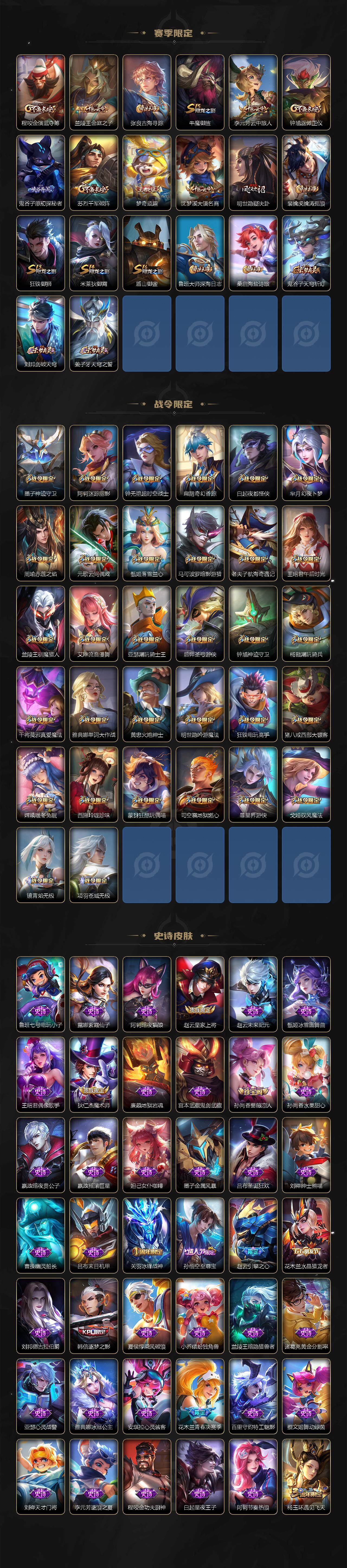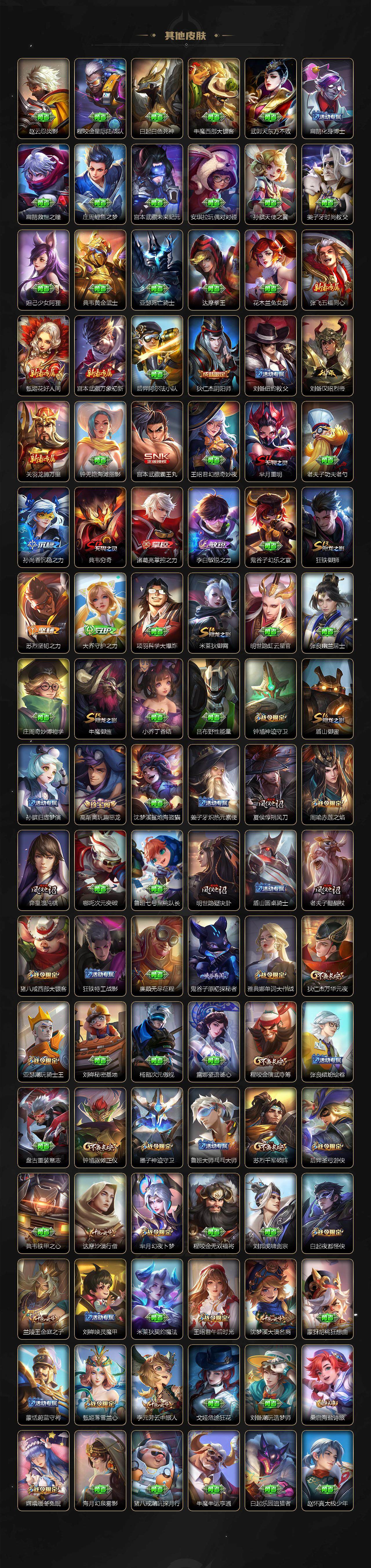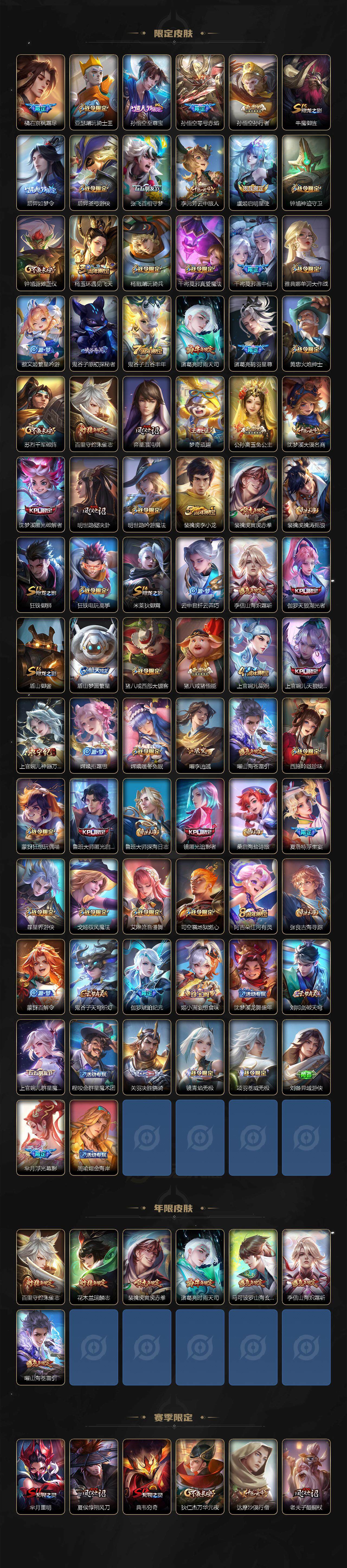 【限定皮肤】:暃埋骨钱,蒙犽顽岩魄,大乔绒语心约,姜子牙天穹之誓,杨戬破阵退雄兵,李白谪仙醉月,狄仁杰阴阳师,赵云皇家上将,赵云引擎之心,赵云百木心枪,墨子神迹守卫,孙尚香蔷薇恋人,孙尚香异界灵契,庄周高山流水,高渐离玩趣恶龙,阿轲迷踪丽影,钟无艳超时空战士,扁鹊奇幻香踪,白起夜都怪侠,芈月重明,芈月幻夜卜梦,周瑜赤莲之焰,元歌云间偶戏,元歌无心,夏侯惇朔风刀,夏侯惇匿光决锋者,甄姬落雪兰心,典韦穷奇,马可波罗暗影游猎,马可波罗山海玄木吟,狄仁杰魔术师,狄仁杰万华元夜,达摩沙漠行僧,项羽海滩派对,老夫子醍醐杖,老夫子航海奇遇记,关羽冰锋战神,程咬金演武夺筹,韩信逐梦之影,韩信傲雪梅枪,王昭君午后时光,兰陵王驯魔猎人,兰陵王金庭之子,花木兰青春决赛季,花木兰瑞麟志,花木兰燃星之曲,不知火舞绯月行,娜可露露前尘镜,橘右京枫霜尽,亚瑟潮玩骑士王,孙悟空至尊宝,孙悟空零号赤焰,孙悟空孙行者,牛魔御旌,后羿如梦令,后羿圣弓游侠,张飞百相守梦,李元芳云中旅人,虞姬启明星使,钟馗神迹守卫,钟馗驱傩正仪,杨玉环遇见飞天,杨戬潮玩骑兵,干将莫邪真爱魔法,干将莫邪画中仙,雅典娜单词大作战,蔡文姬繁星吟游,鬼谷